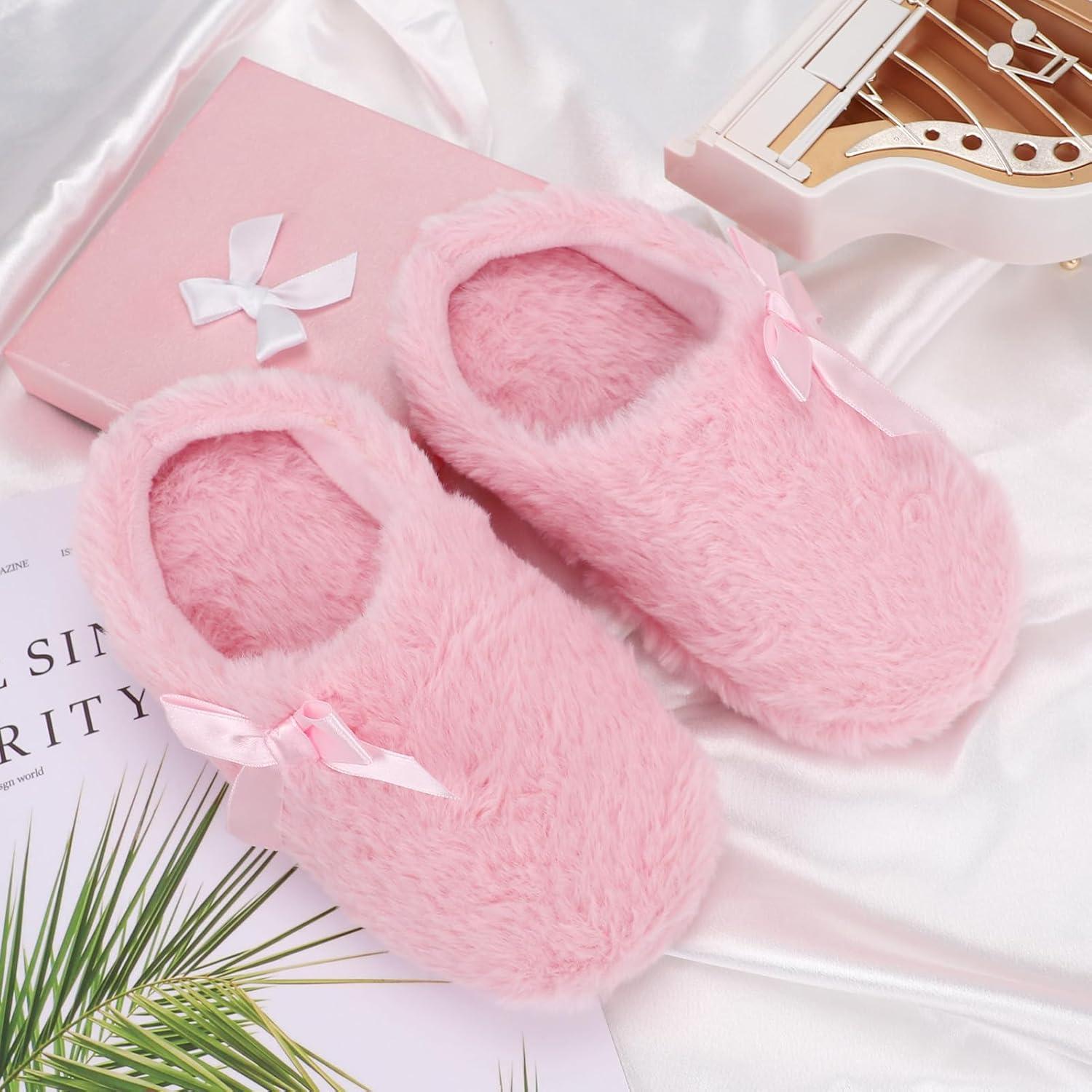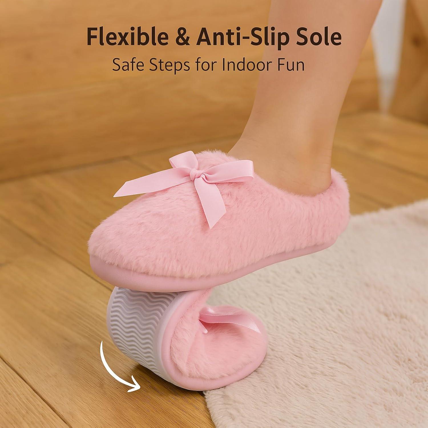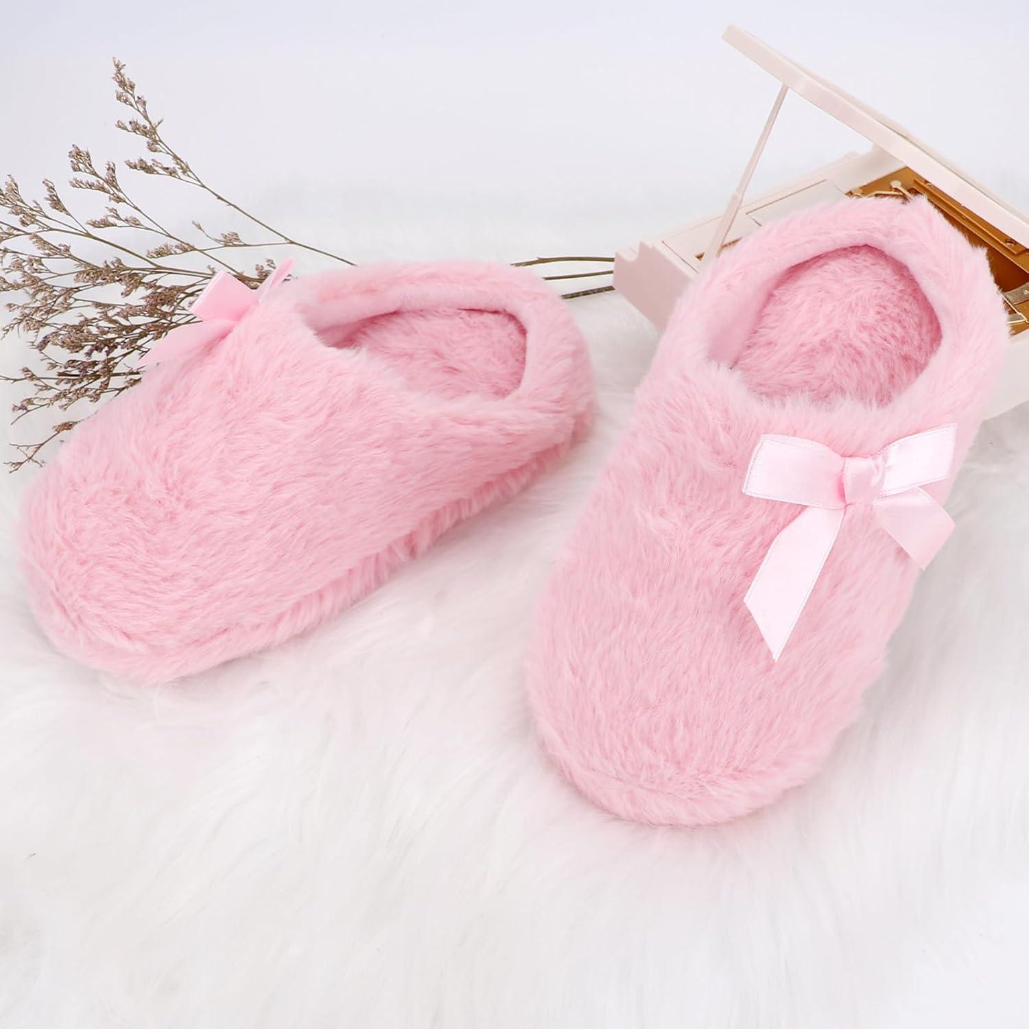 Girls Plush Faux Fur Slip on House Slippers Clog with Memory Foam – Bedroom Slippers Outdoor Indoor Faux Fur Lined(Bowknot – Pink)