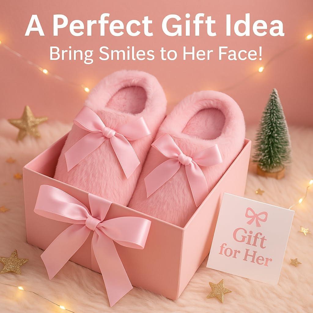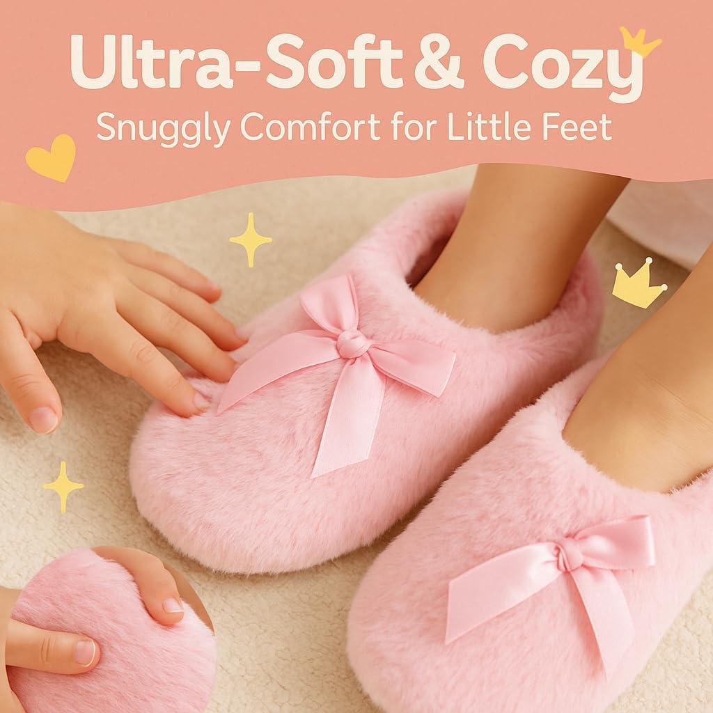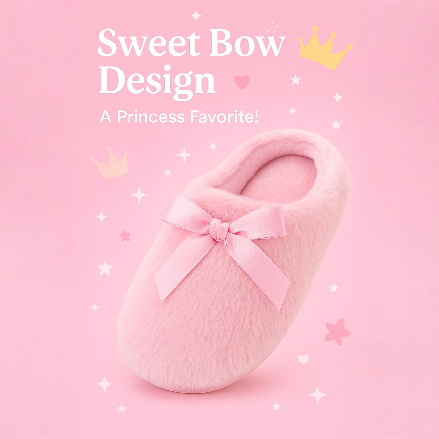 Girls Plush Faux Fur Slip on House Slippers Clog with Memory Foam – Bedroom Slippers Outdoor Indoor Faux Fur Lined(Bowknot – Pink)
