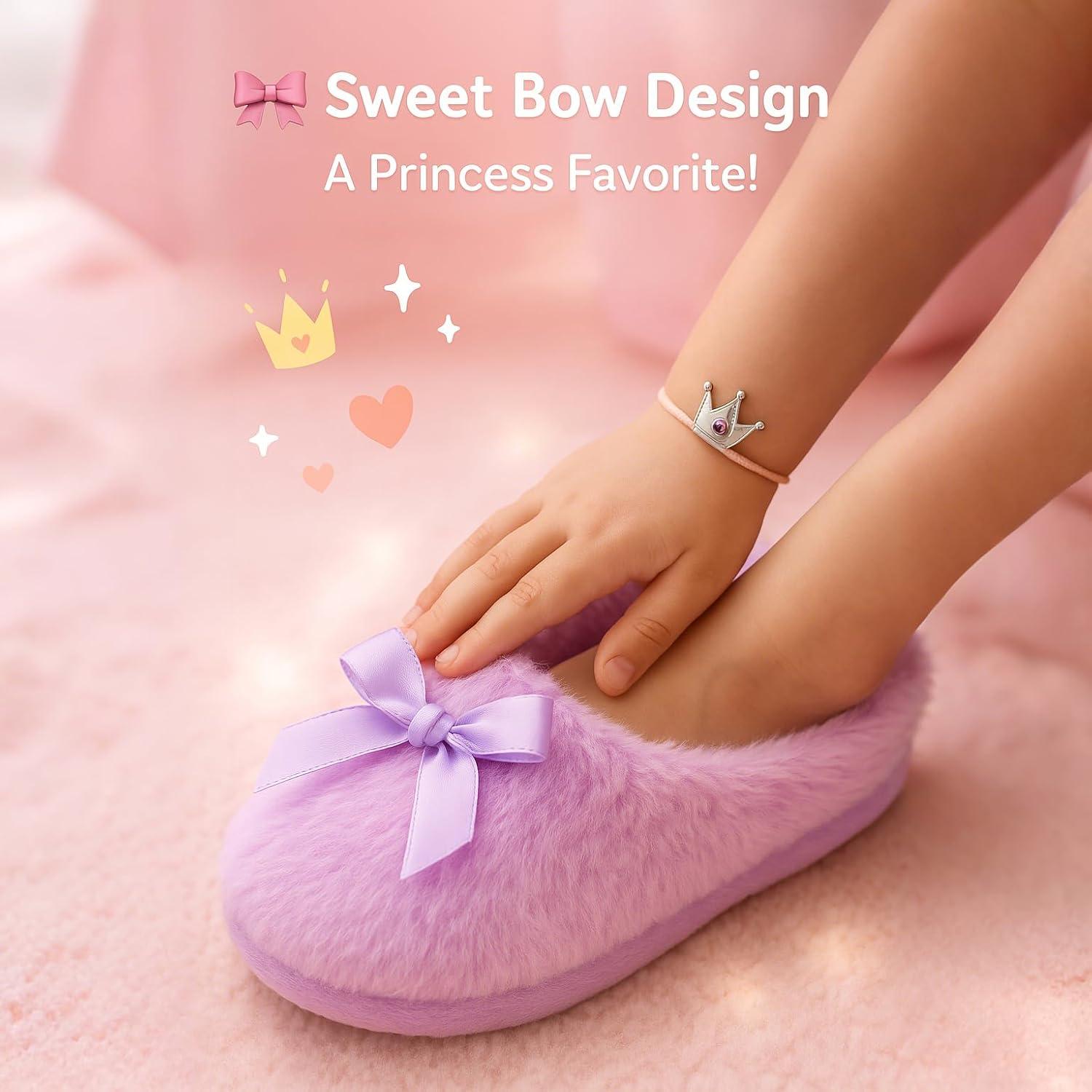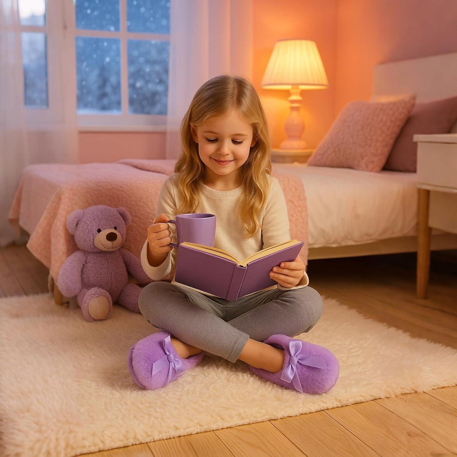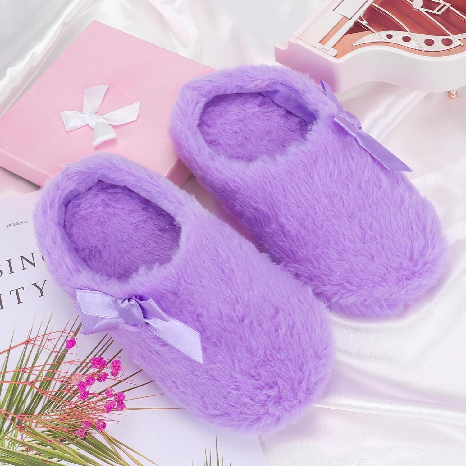 Girls Plush Faux Fur Slip on House Slippers Clog with Memory Foam – Bedroom Slippers Outdoor Indoor Faux Fur Lined(Bowknot – Purple)