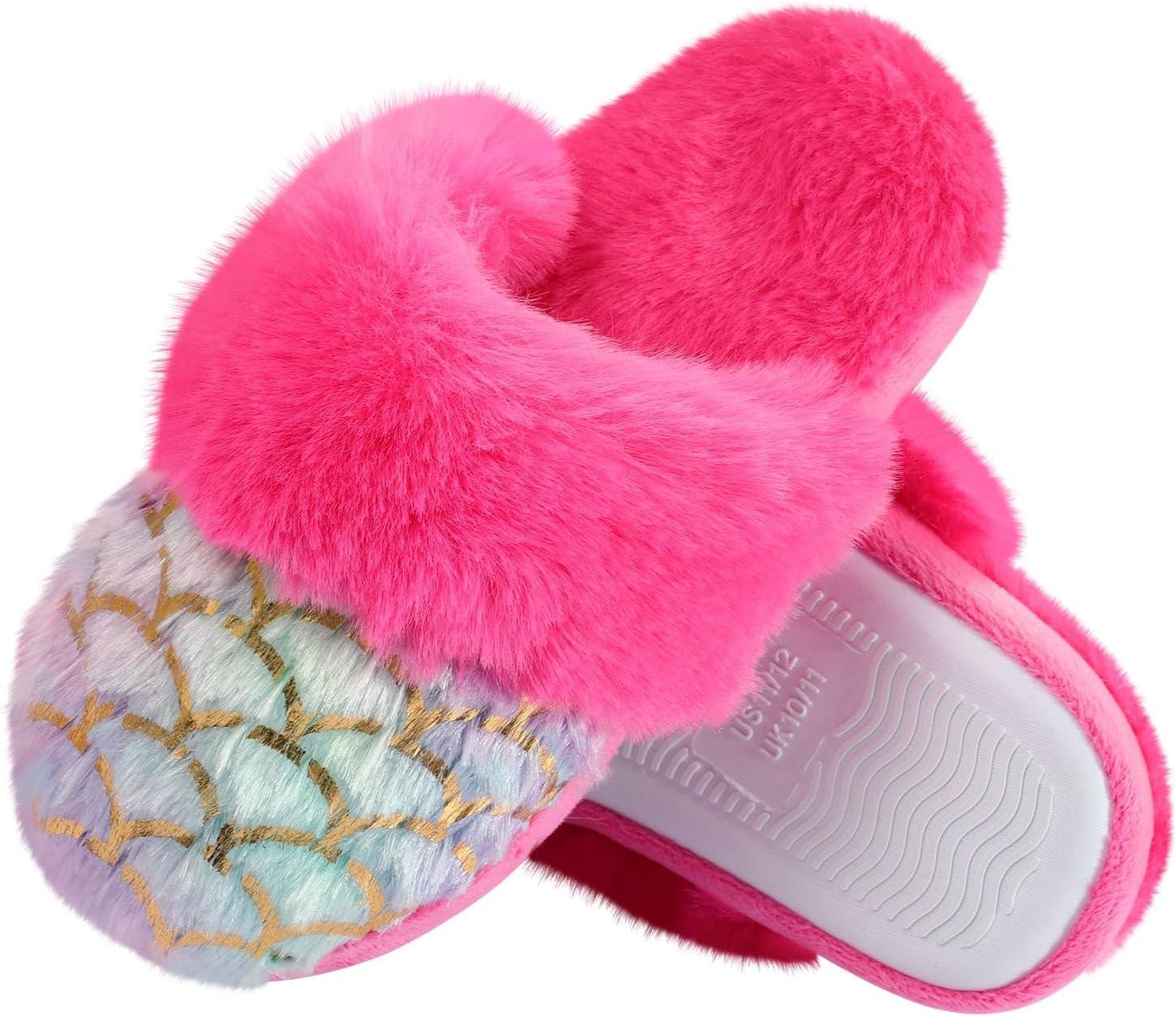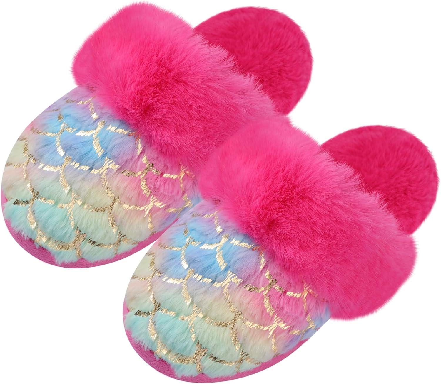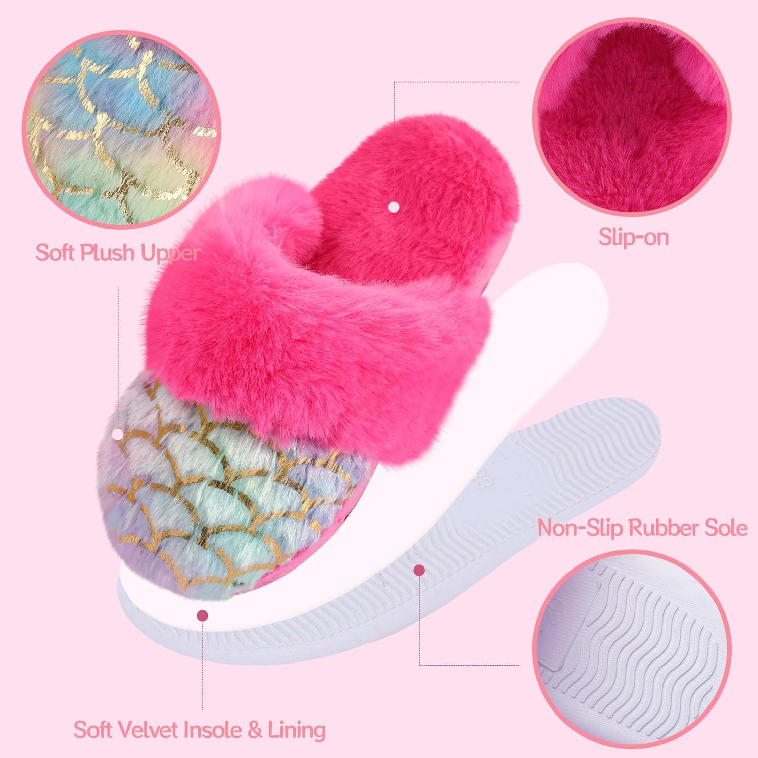Girls Plush House Slippers Fluffy Multicolor Mermaid Slippers, Cute Faux Fur Slip-on Shoes Memory Foam House Slipper(Mermaid – Rose)