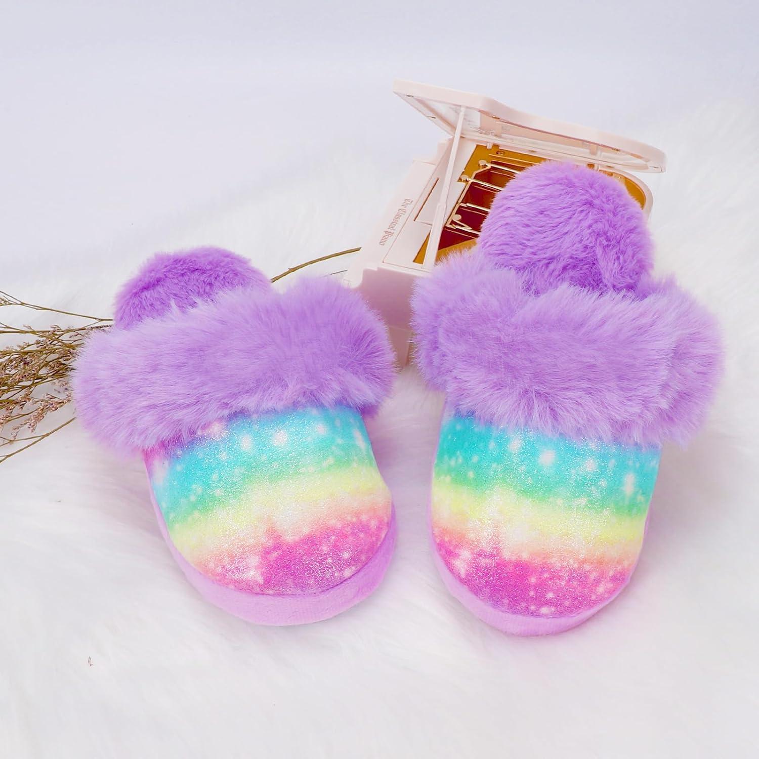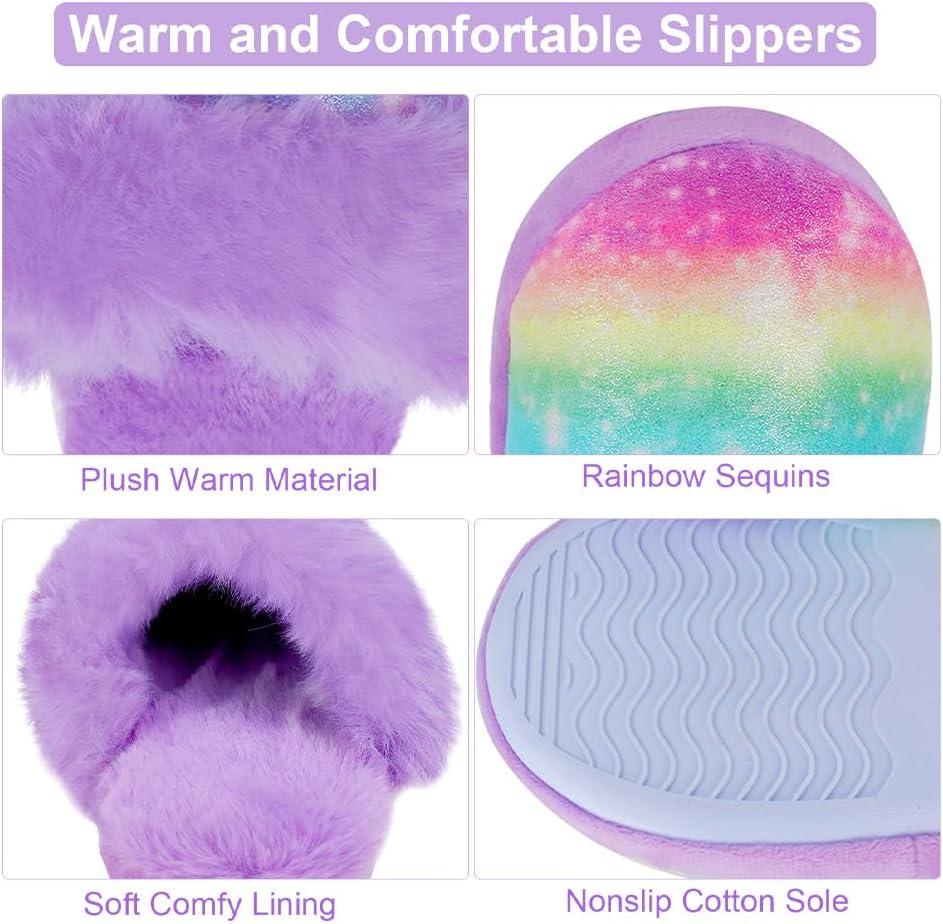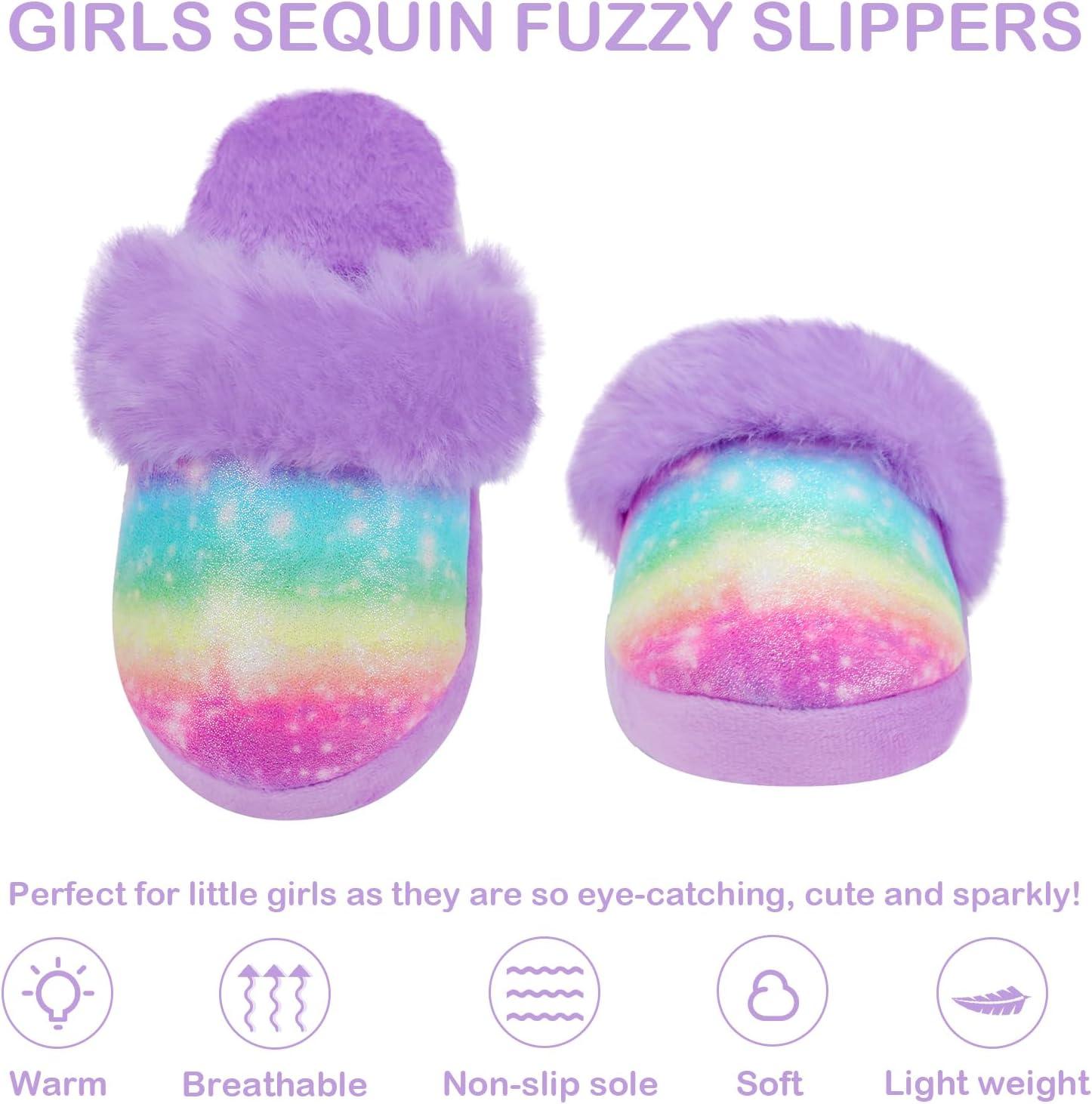 Girls Plush House Slippers Fluffy Sequin Slippers, Cute Faux Fur Slip-on Shoes Memory Foam House Slipper(Mermaid – Rainbow Purple)