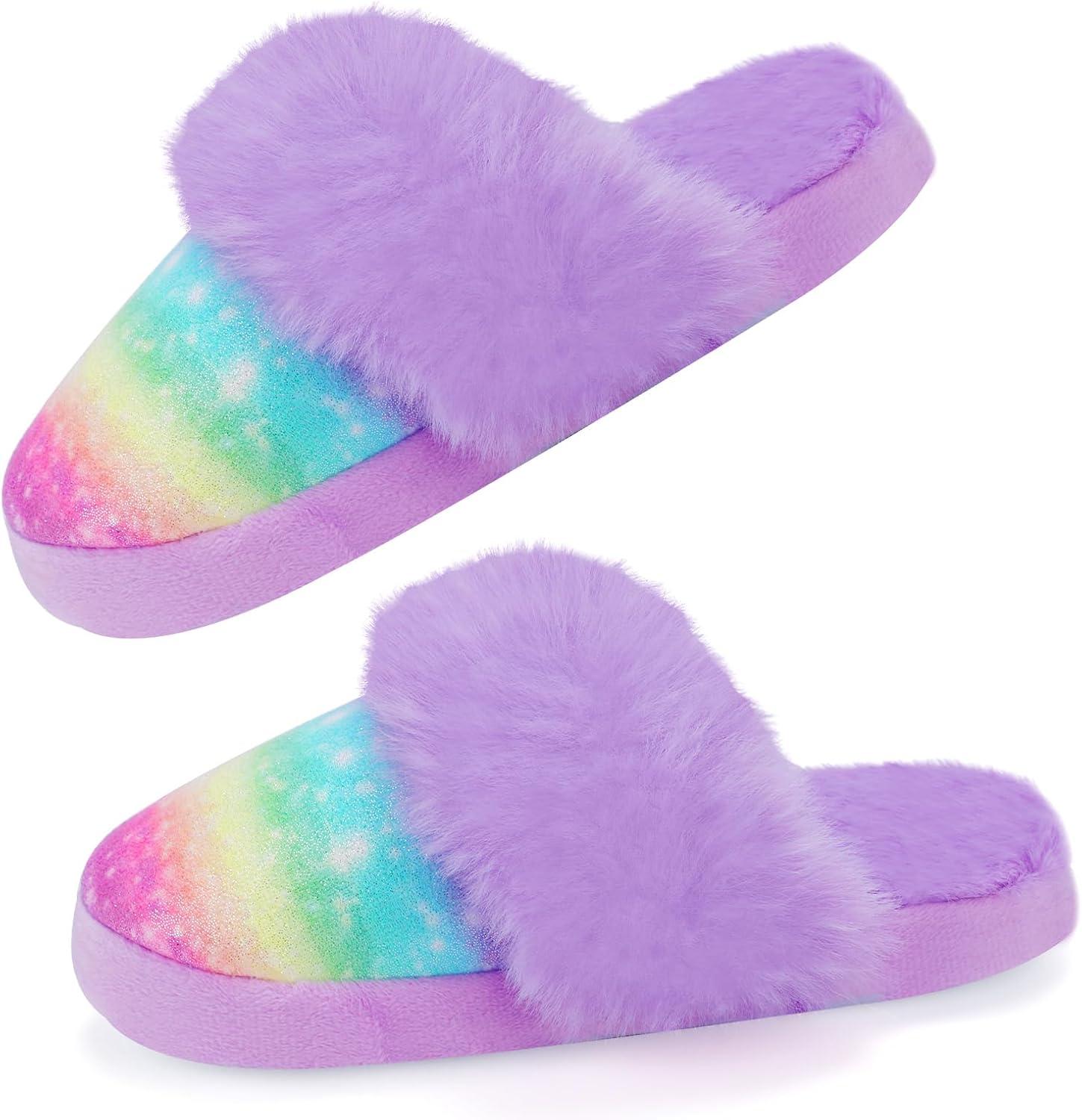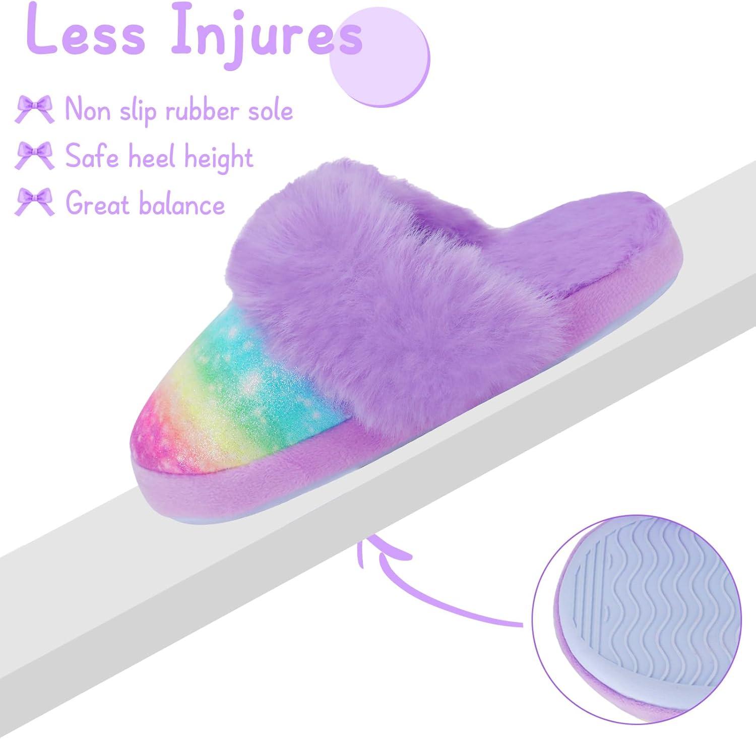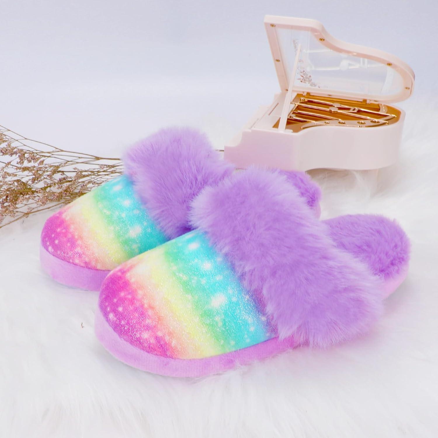 Girls Plush House Slippers Fluffy Sequin Slippers, Cute Faux Fur Slip-on Shoes Memory Foam House Slipper(Mermaid – Rainbow Purple)