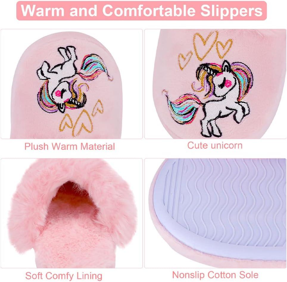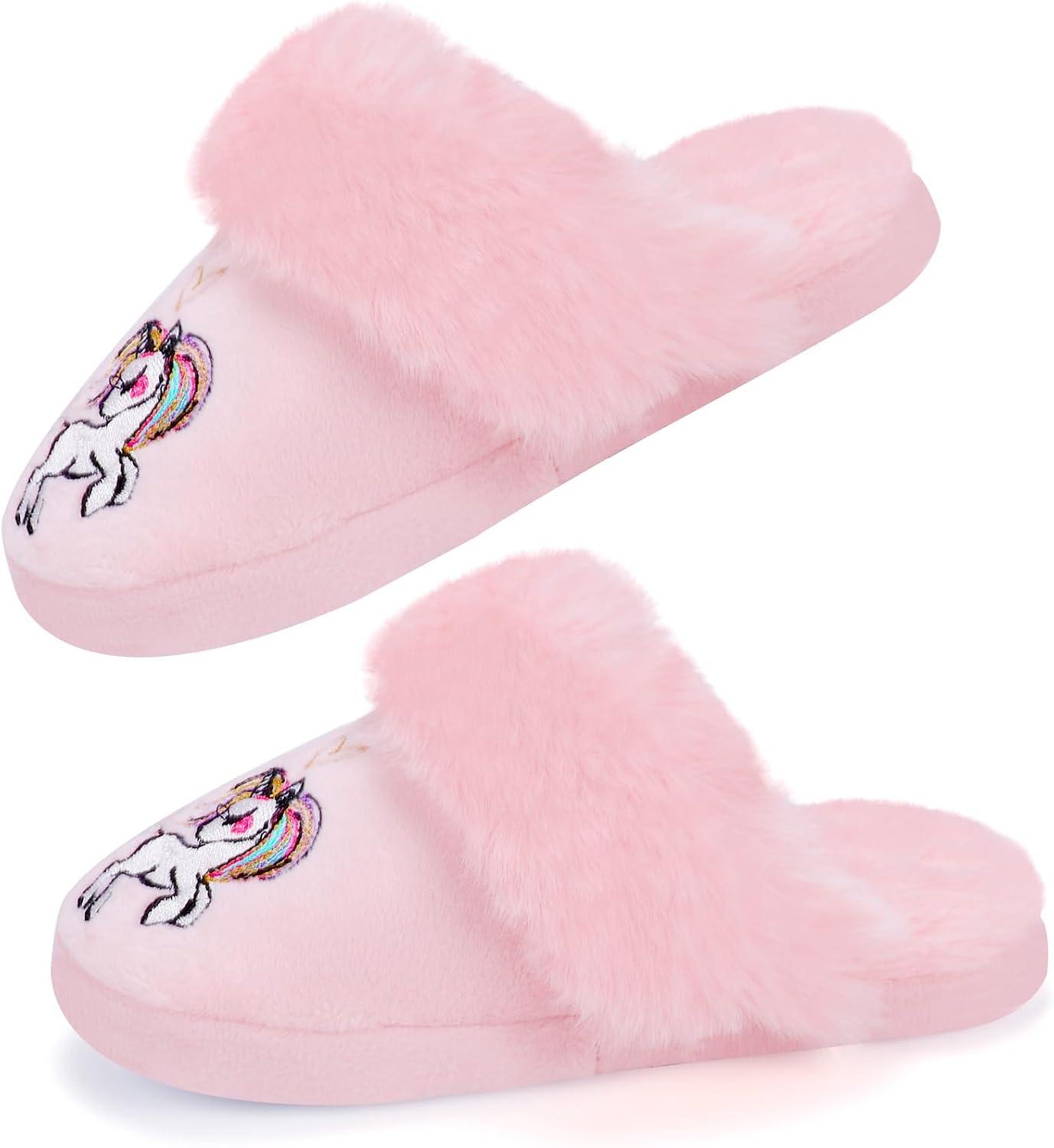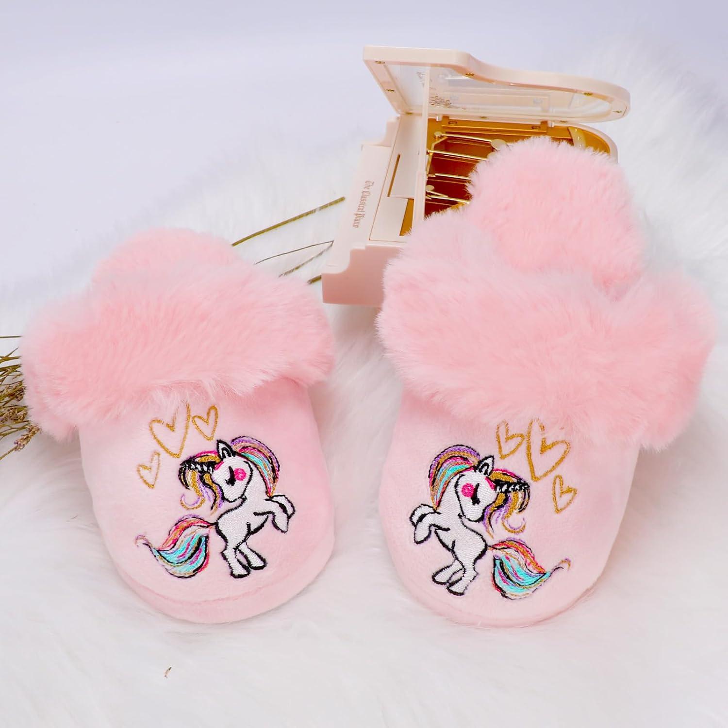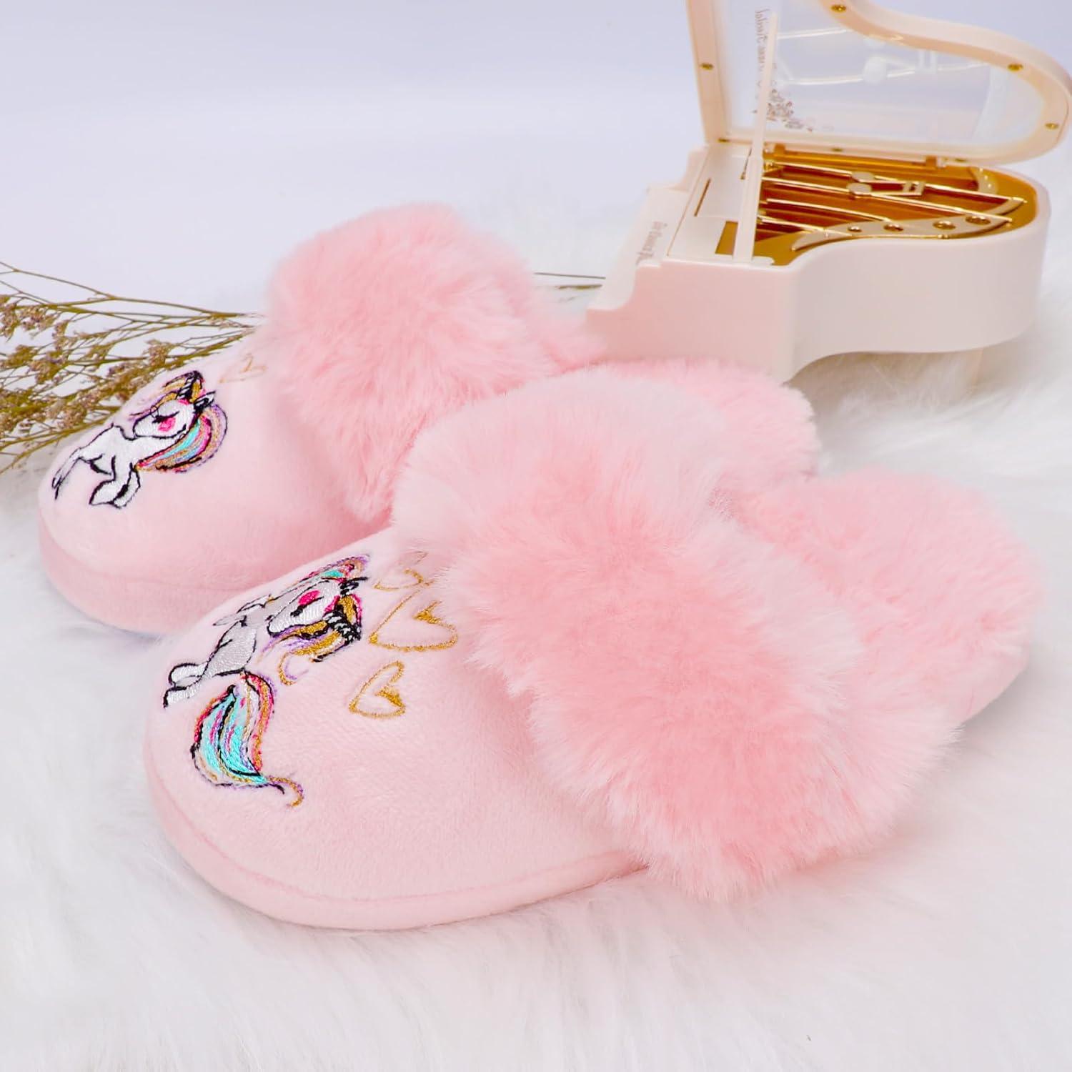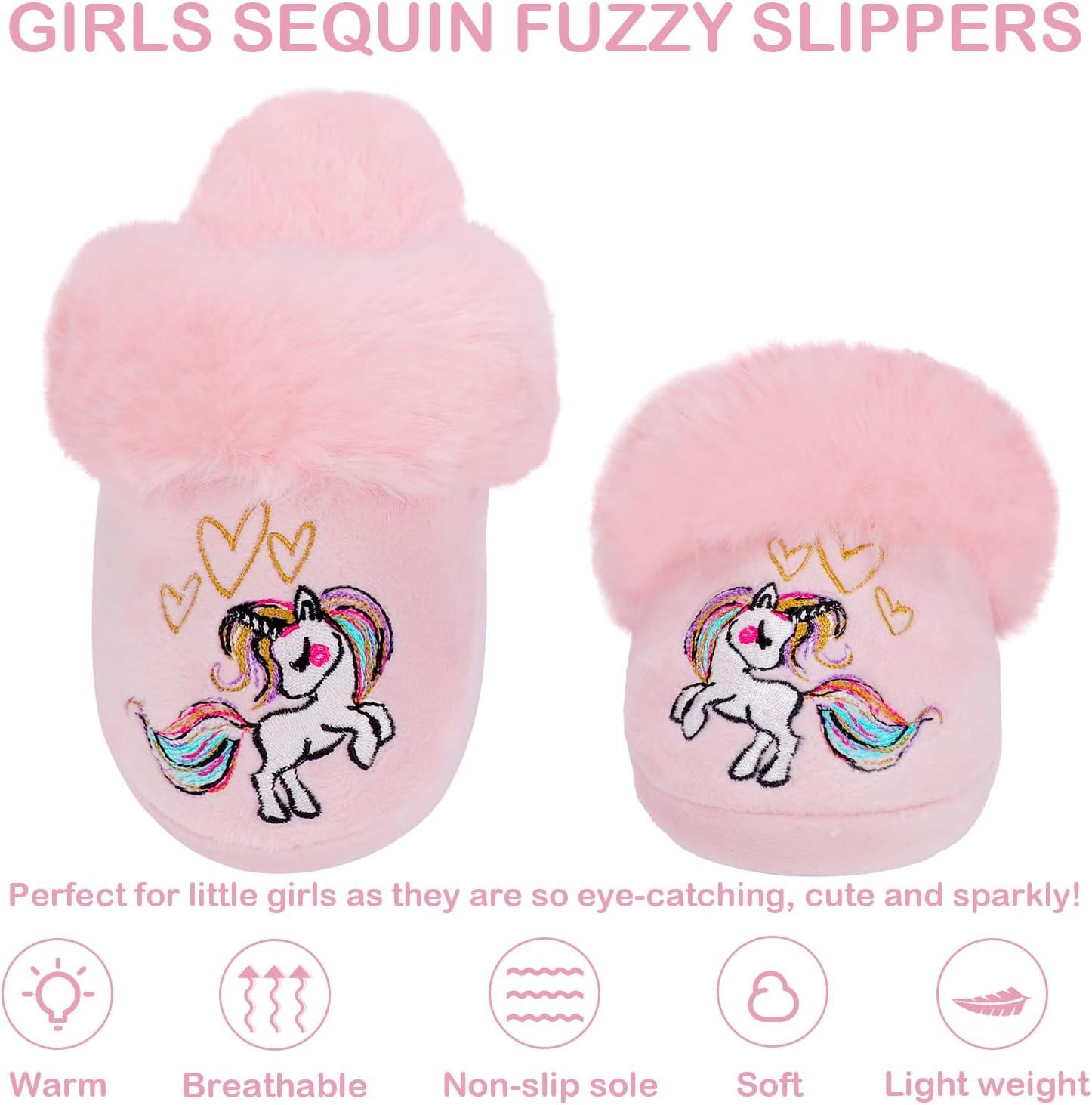 Girls Plush House Slippers Fluffy Sequin Slippers, Cute Faux Fur Slip-on Shoes Memory Foam House Slipper(Unicorn – Pink)