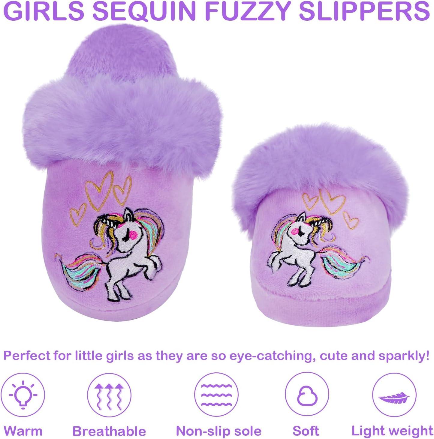 Girls Plush House Slippers Fluffy Sequin Slippers, Cute Faux Fur Slip-on Shoes Memory Foam House Slipper(Unicorn – Purple)