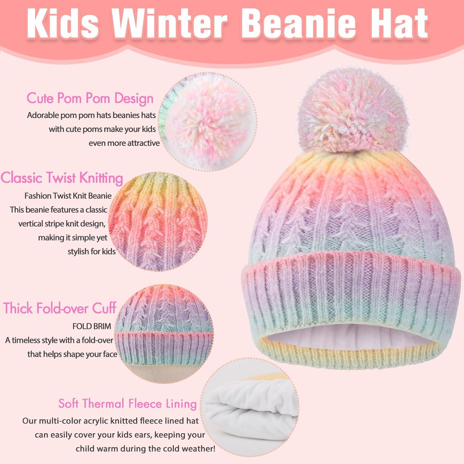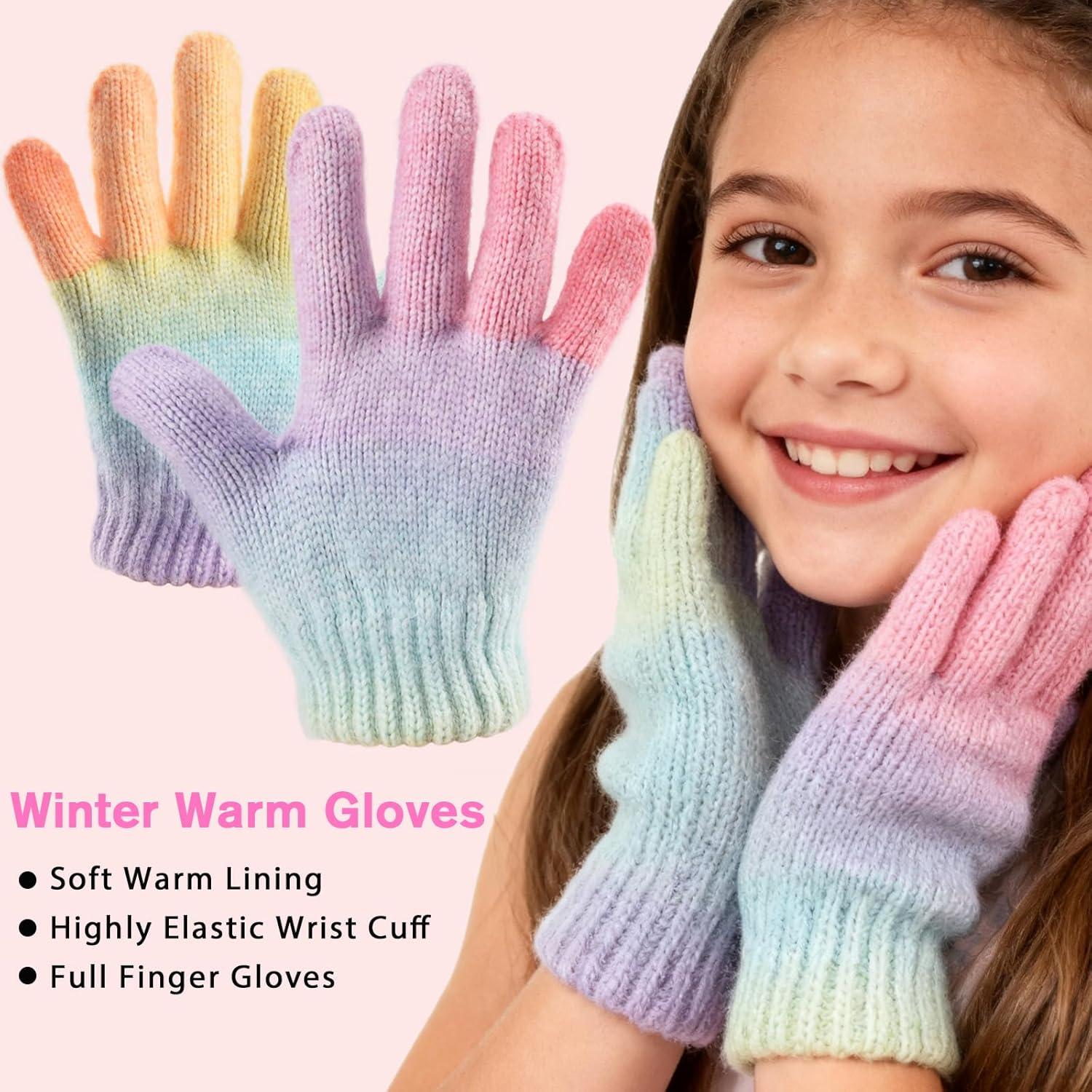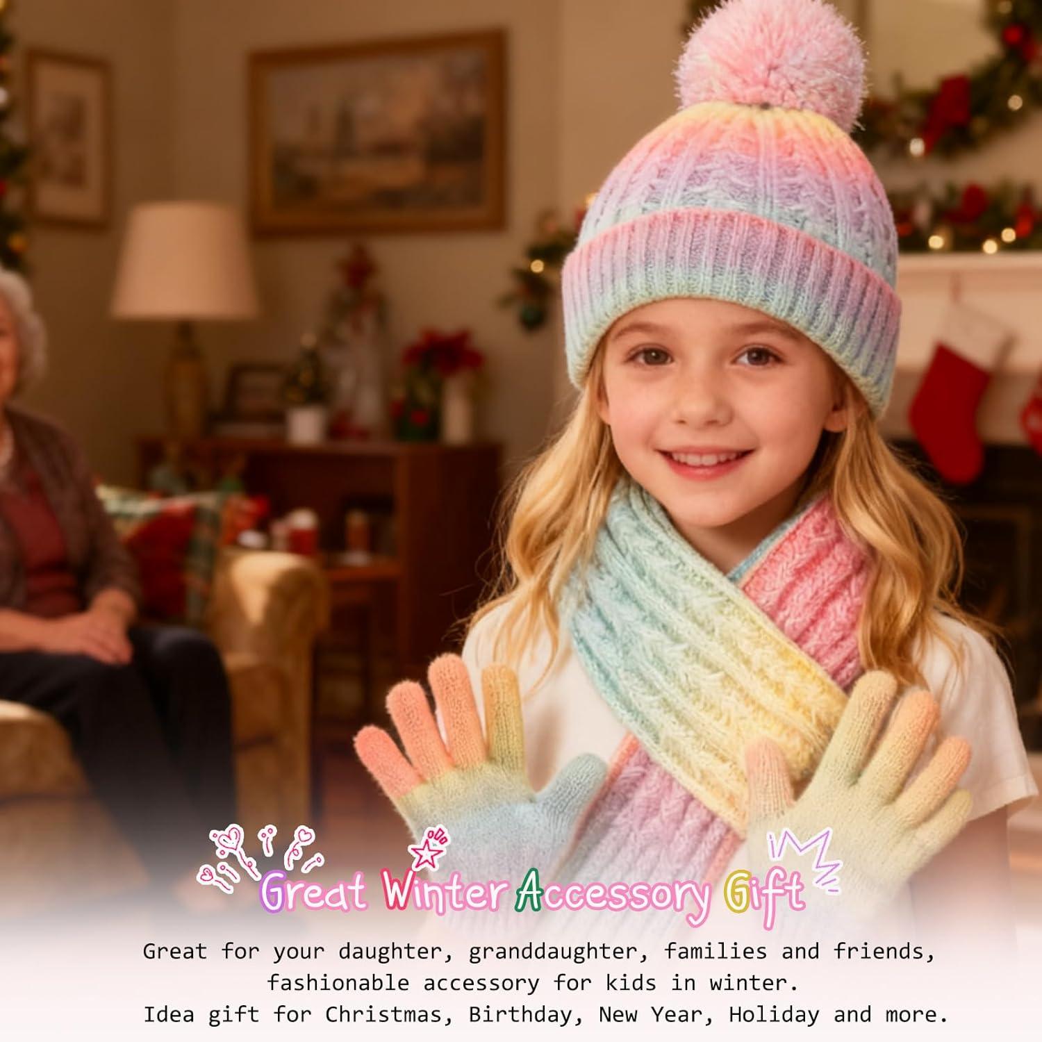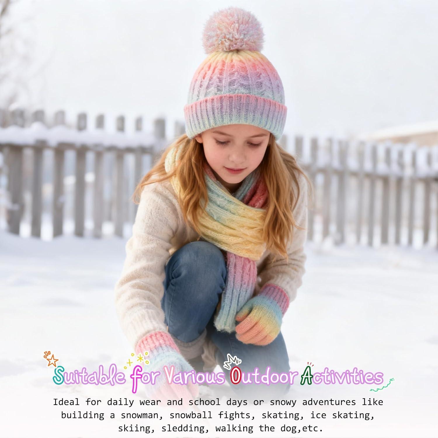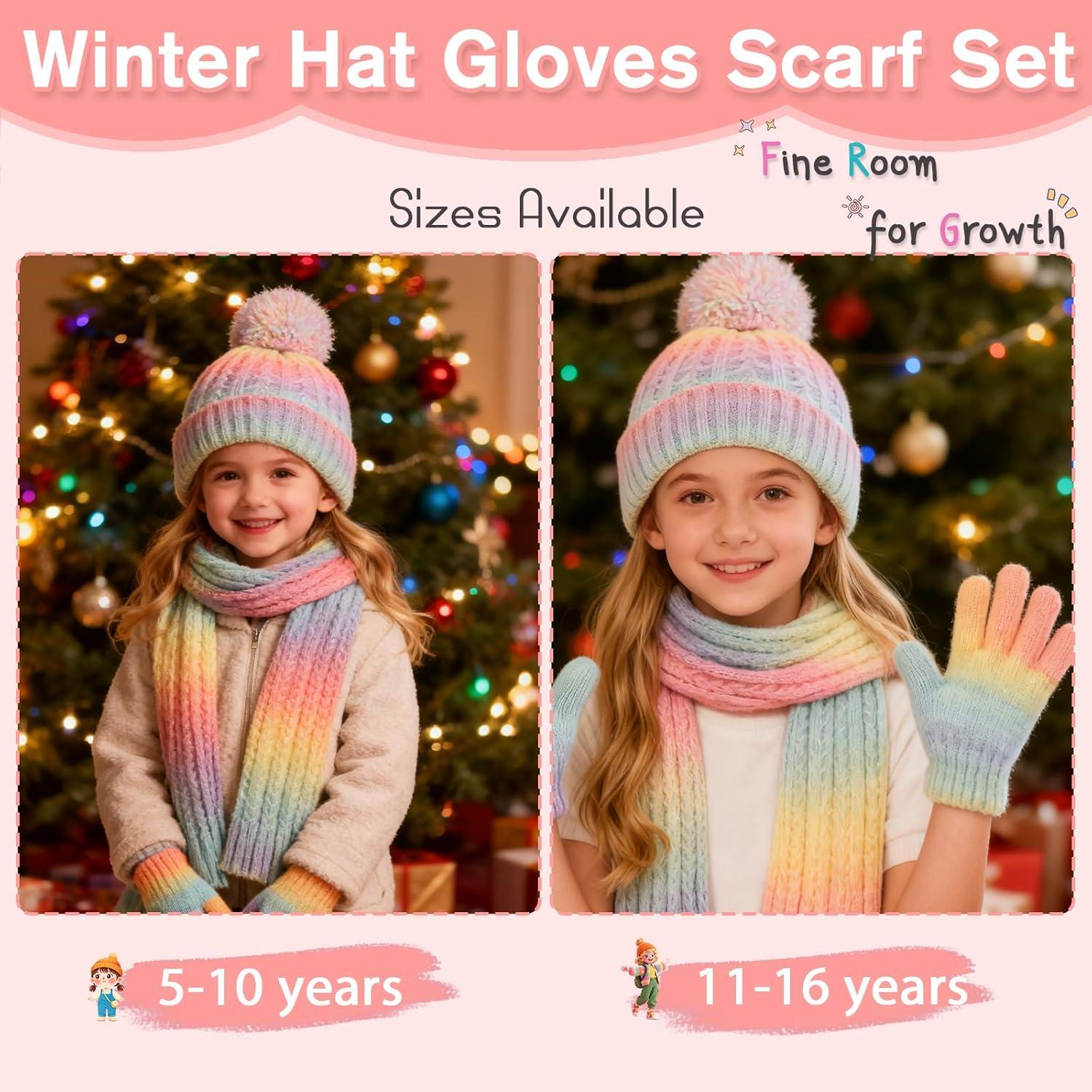 Girls Winter Hat Scarf Gloves Set Beanie Hat with Warm Fleece Lined, Kids Hat and Gloves Set for Girls 5-10Y and 11-16 Years(Multicolor01-3pcs)