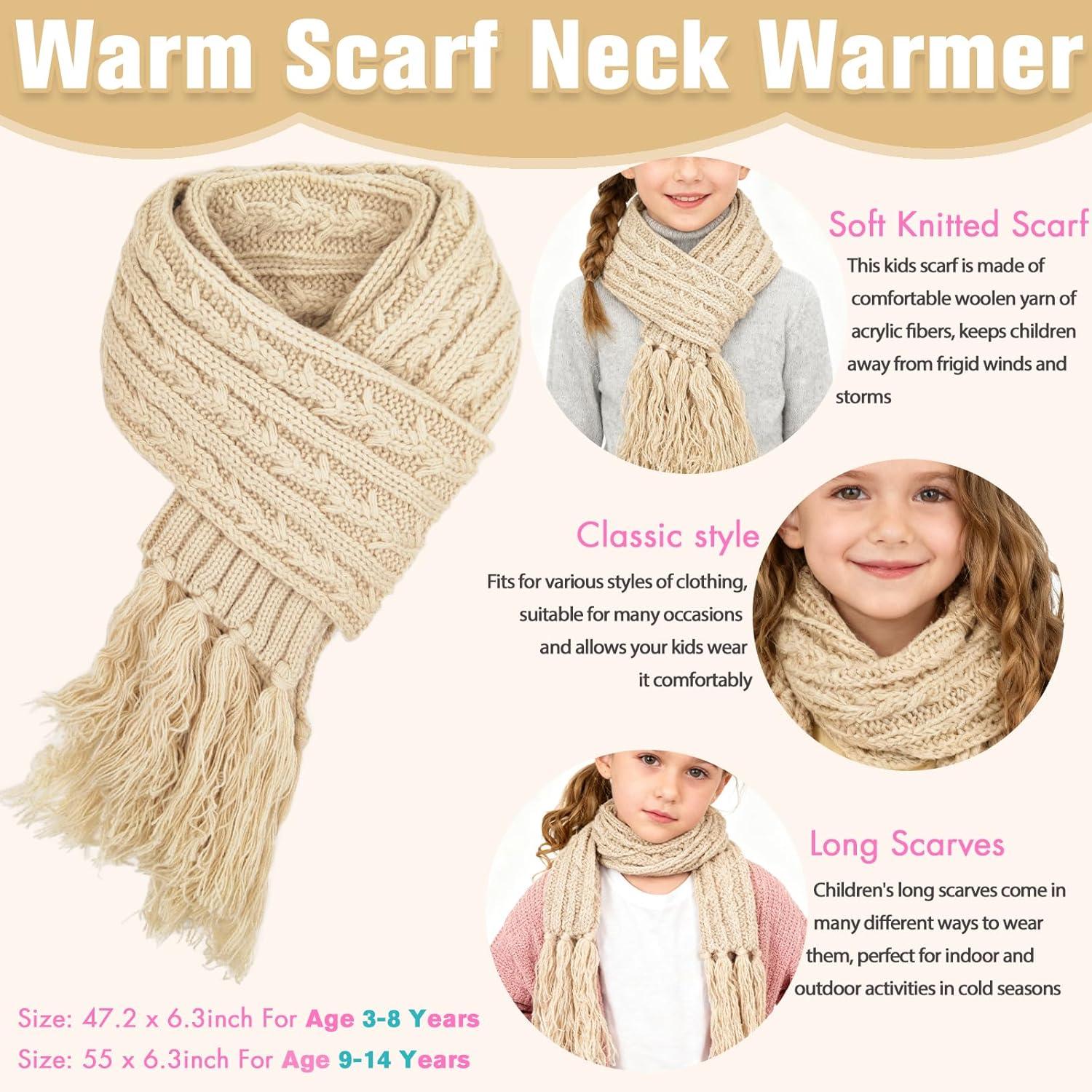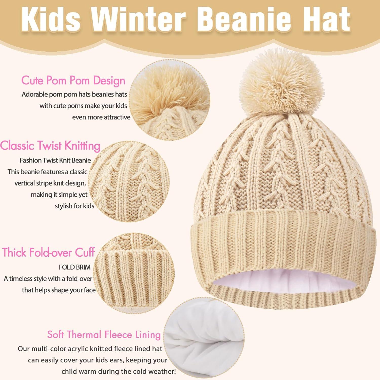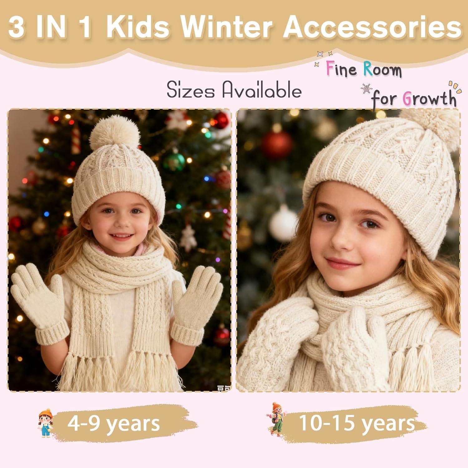 Girls Winter Hat Scarf Gloves Set, Toddler Fleece Lined Beanie Hat with Pom Rainbow Hat Scarf Mittens for Girl 4-15 Year(Beige-3pcs)