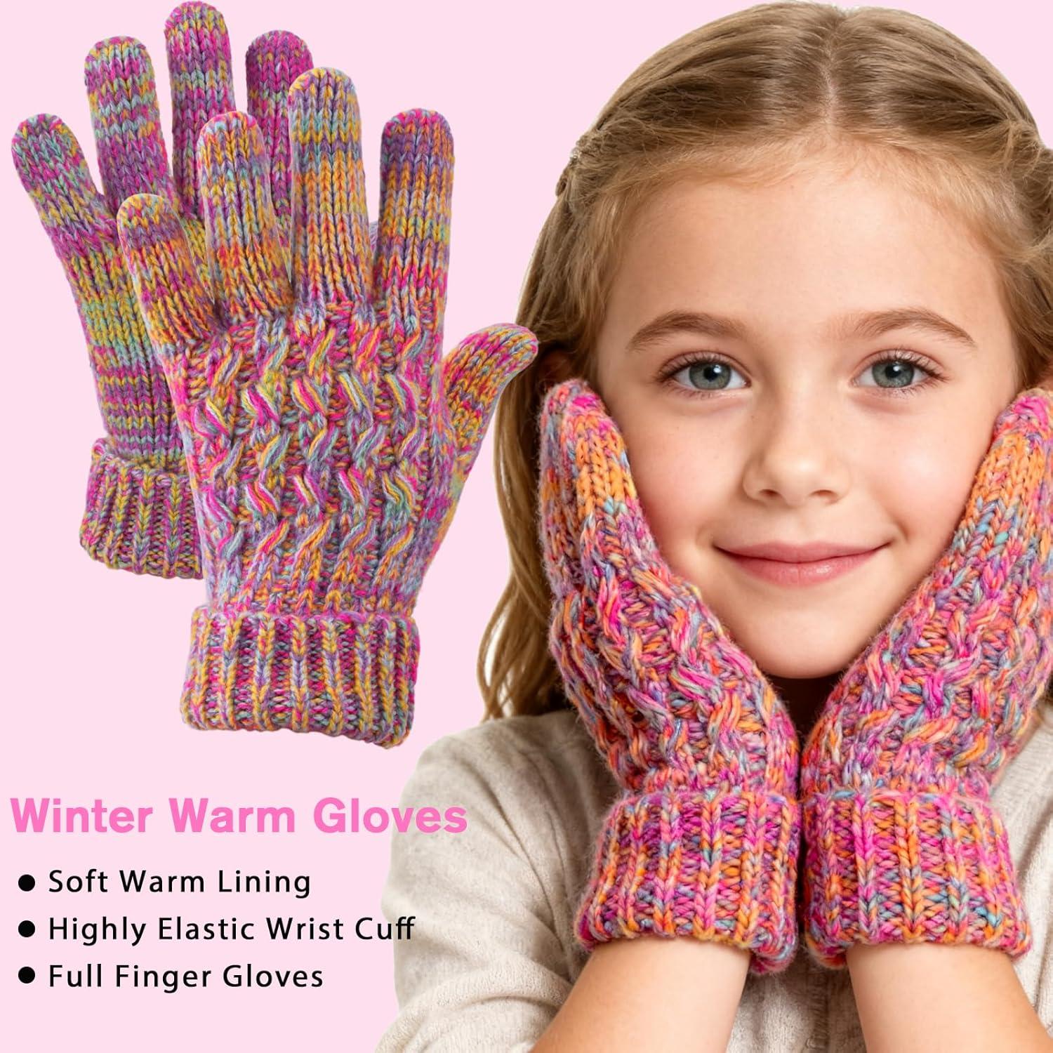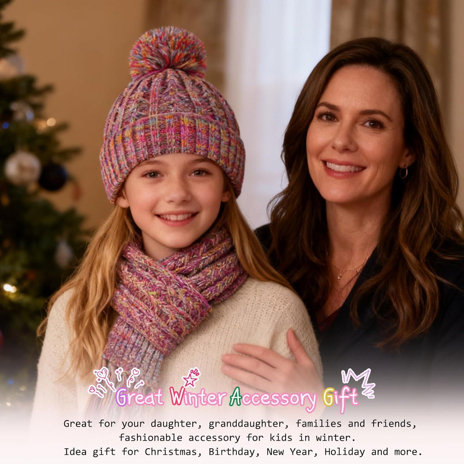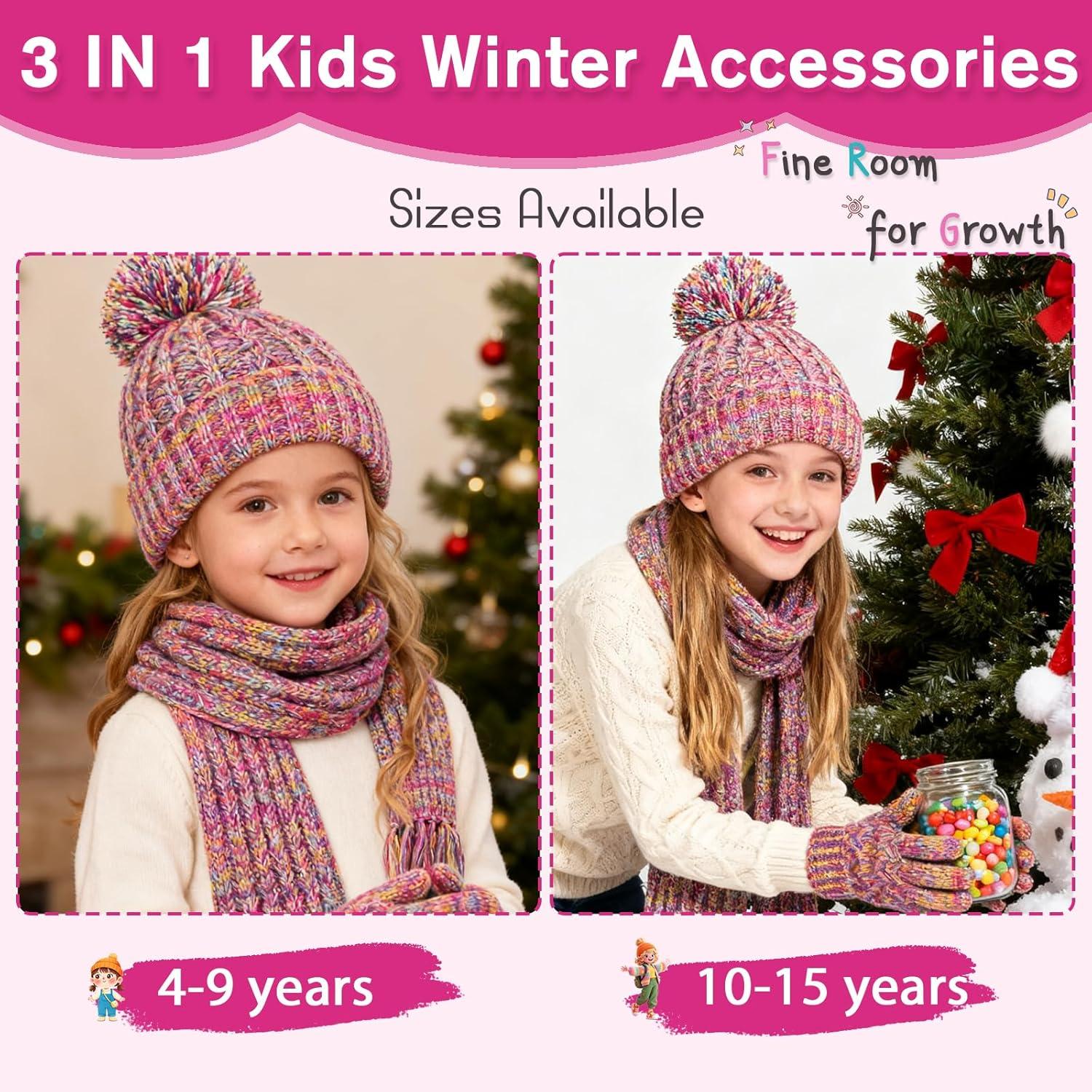 Girls Winter Hat Scarf Gloves Set, Toddler Fleece Lined Beanie Hat with Pom Rainbow Hat Scarf Mittens for Girl 4-15 Year(Multicolor-3pcs)