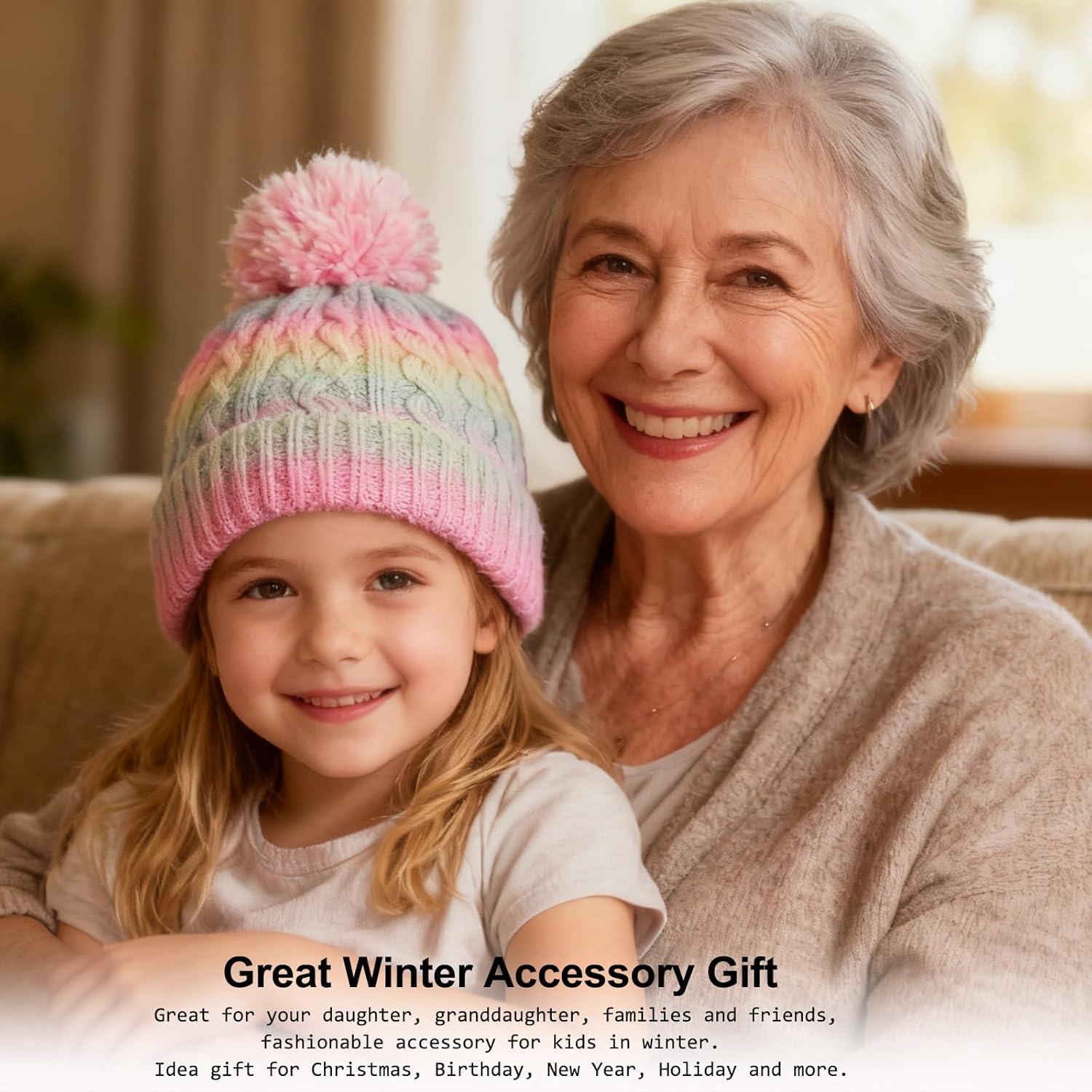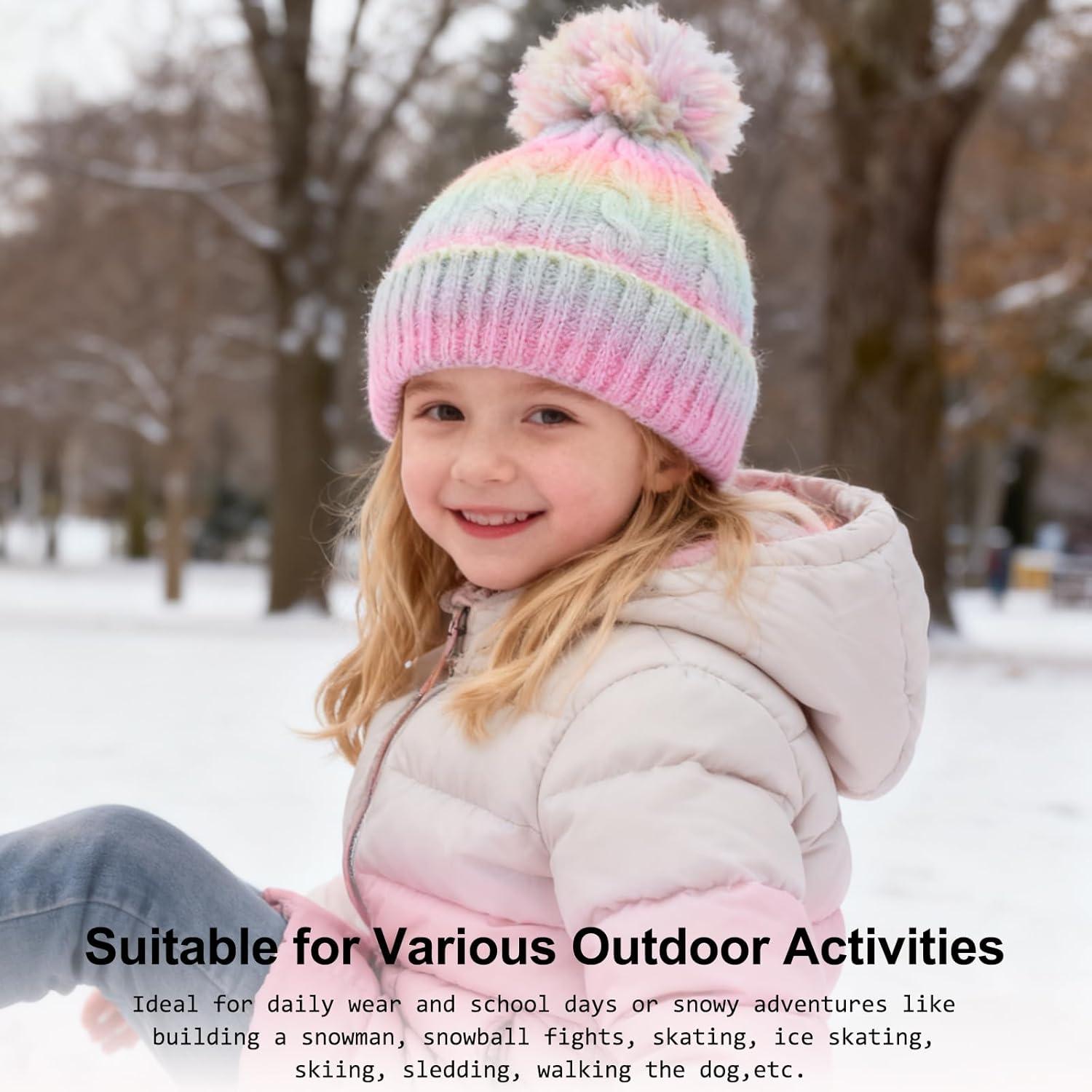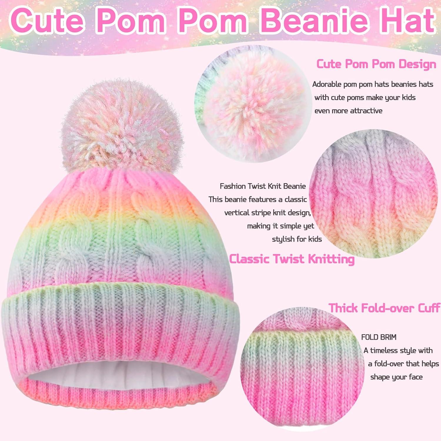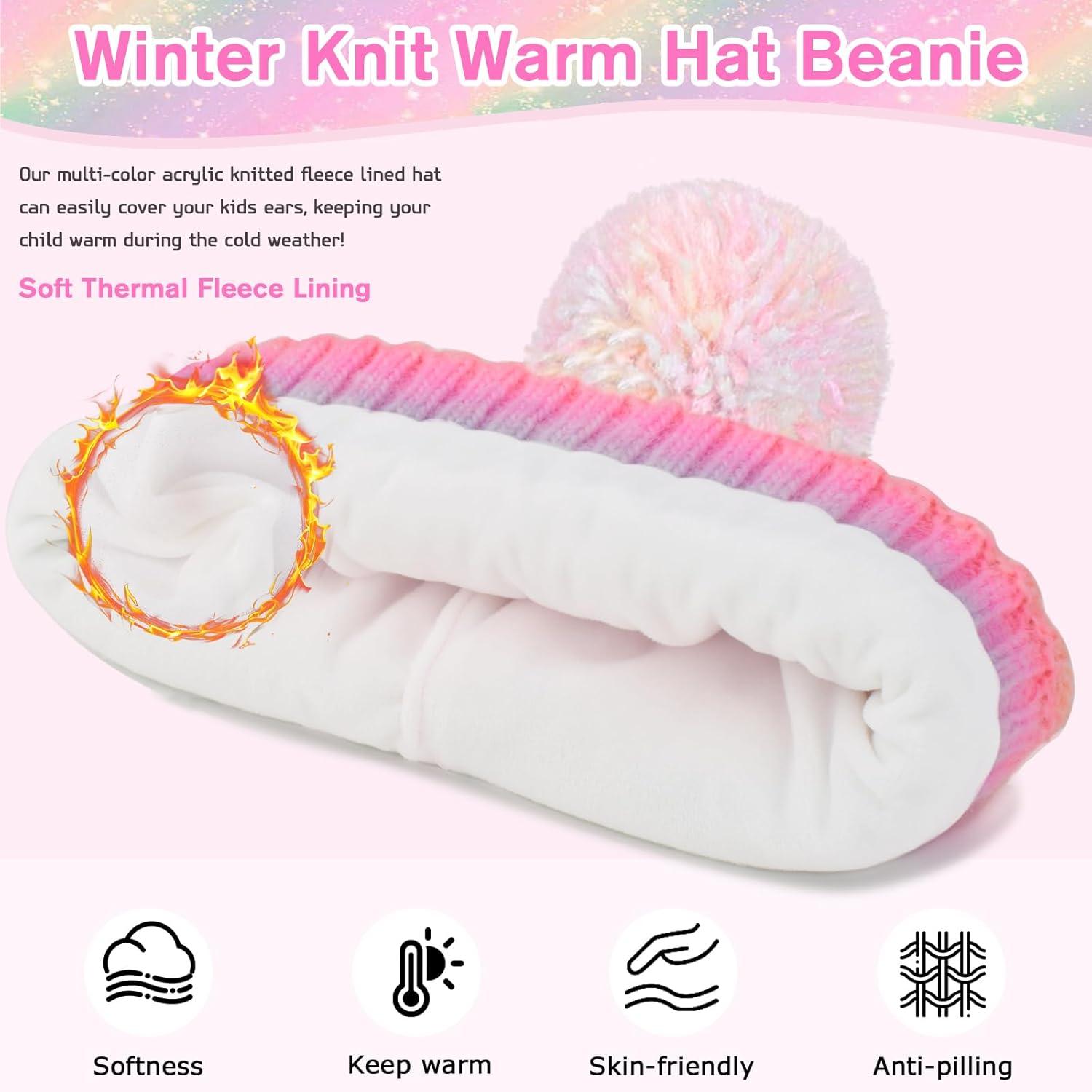 Girls Winter Hat Scarf Gloves Set, Toddler Fleece Lined Beanie Hat with Pom Rainbow Hat Scarf Mittens for Girl 4-15 Year(Multicolor-73(hat))