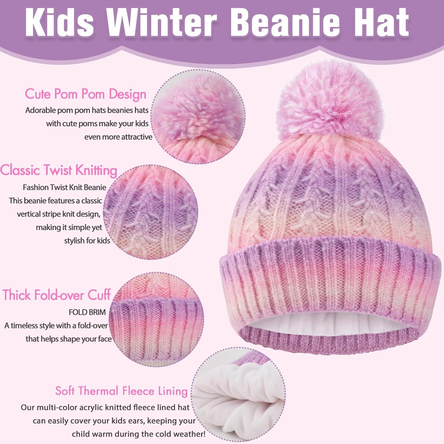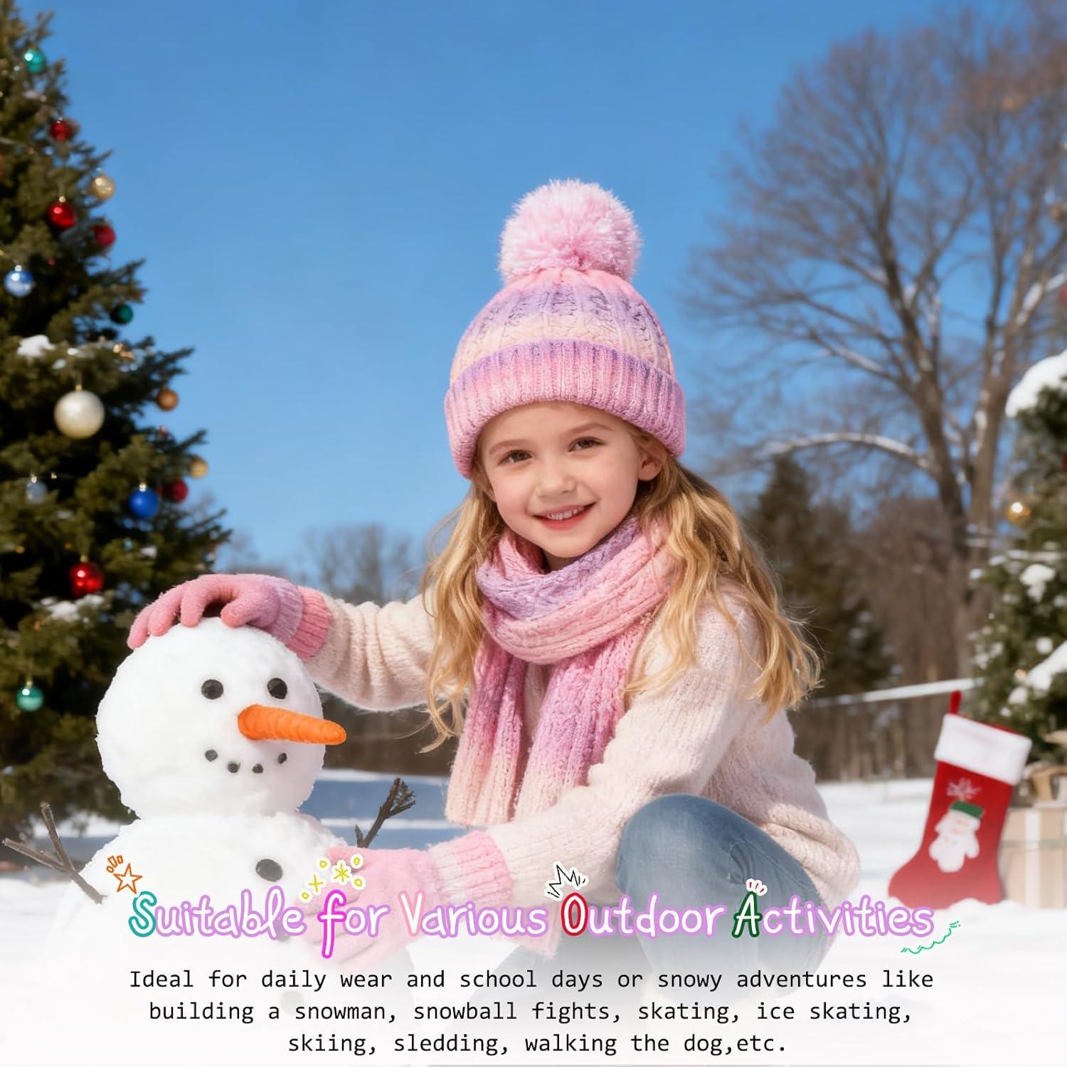 Girls Winter Hat Scarf Gloves Set, Toddler Fleece Lined Beanie Hat with Pom Rainbow Hat Scarf Mittens for Girl 4-15 Year(Multicolor41-3pcs)