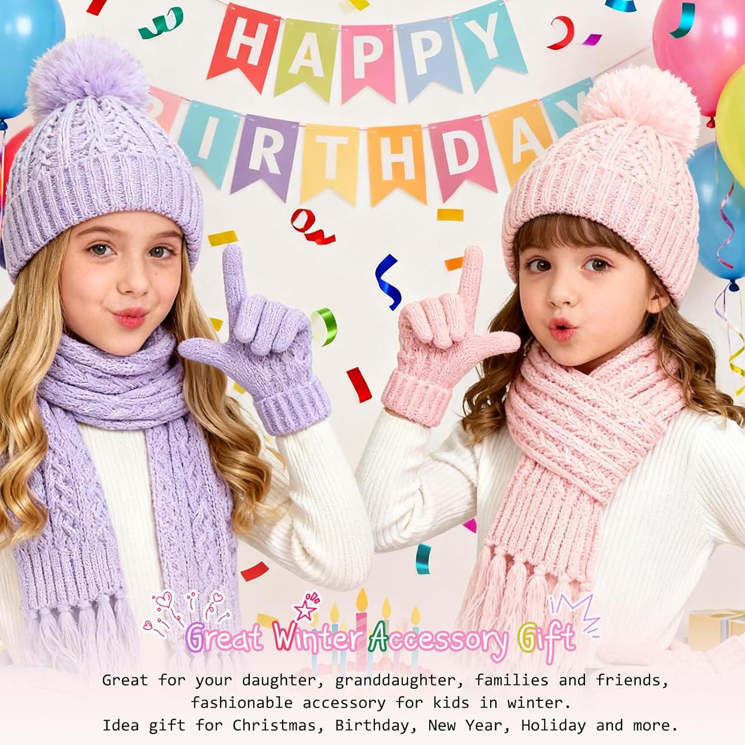 Kids Winter Hat Scarf Gloves Set, Toddler Beanie Hat Warm Fleece Lined Knit Beanies Cap for Boy Girl 2-14 Years(Pink-3pcs)