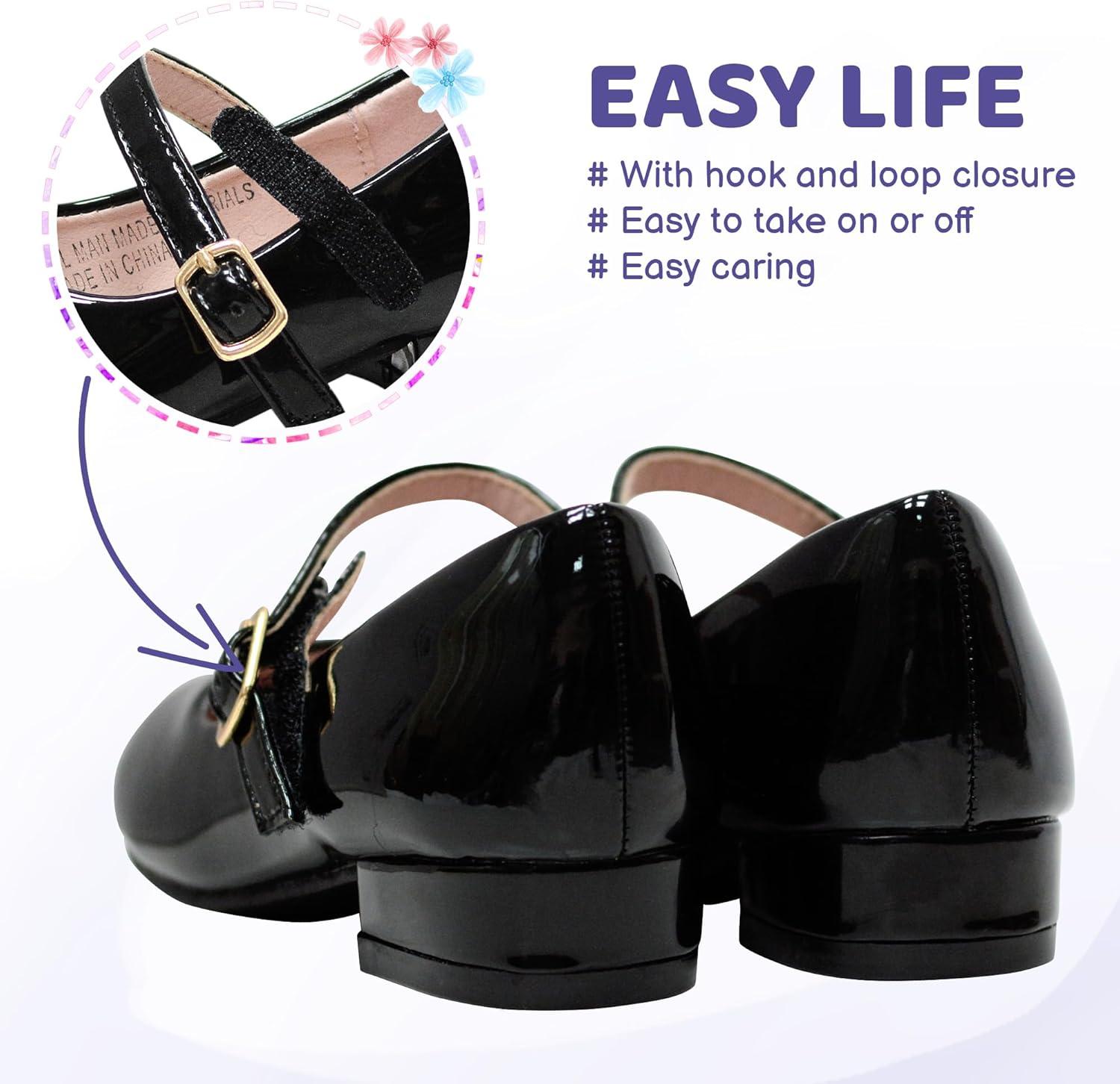 LseLom Girls Dress Shoes-Mary Jane Shoes for Girls Low Heel Princess Hook and Loop Dress Shoes Party Wedding Flats for Little/Big Kids(Black)