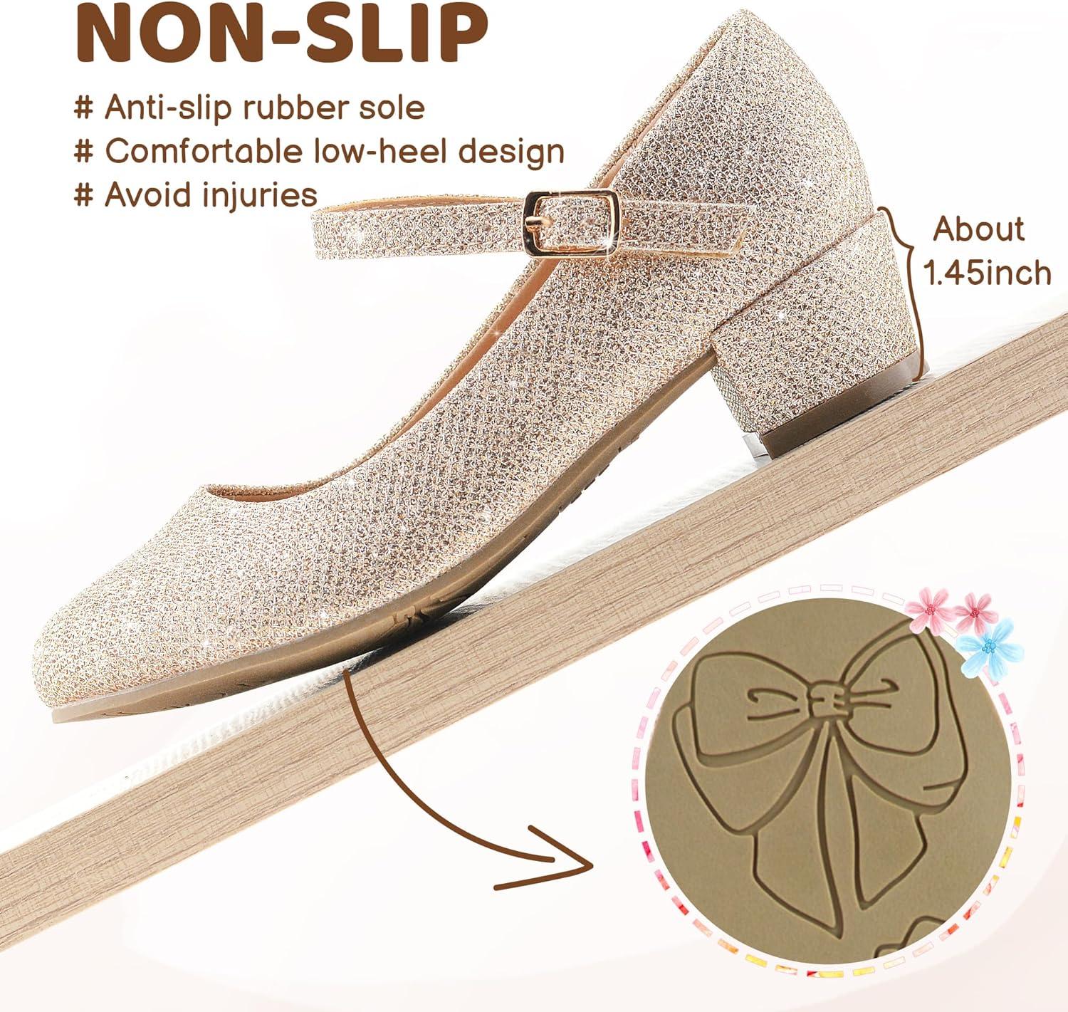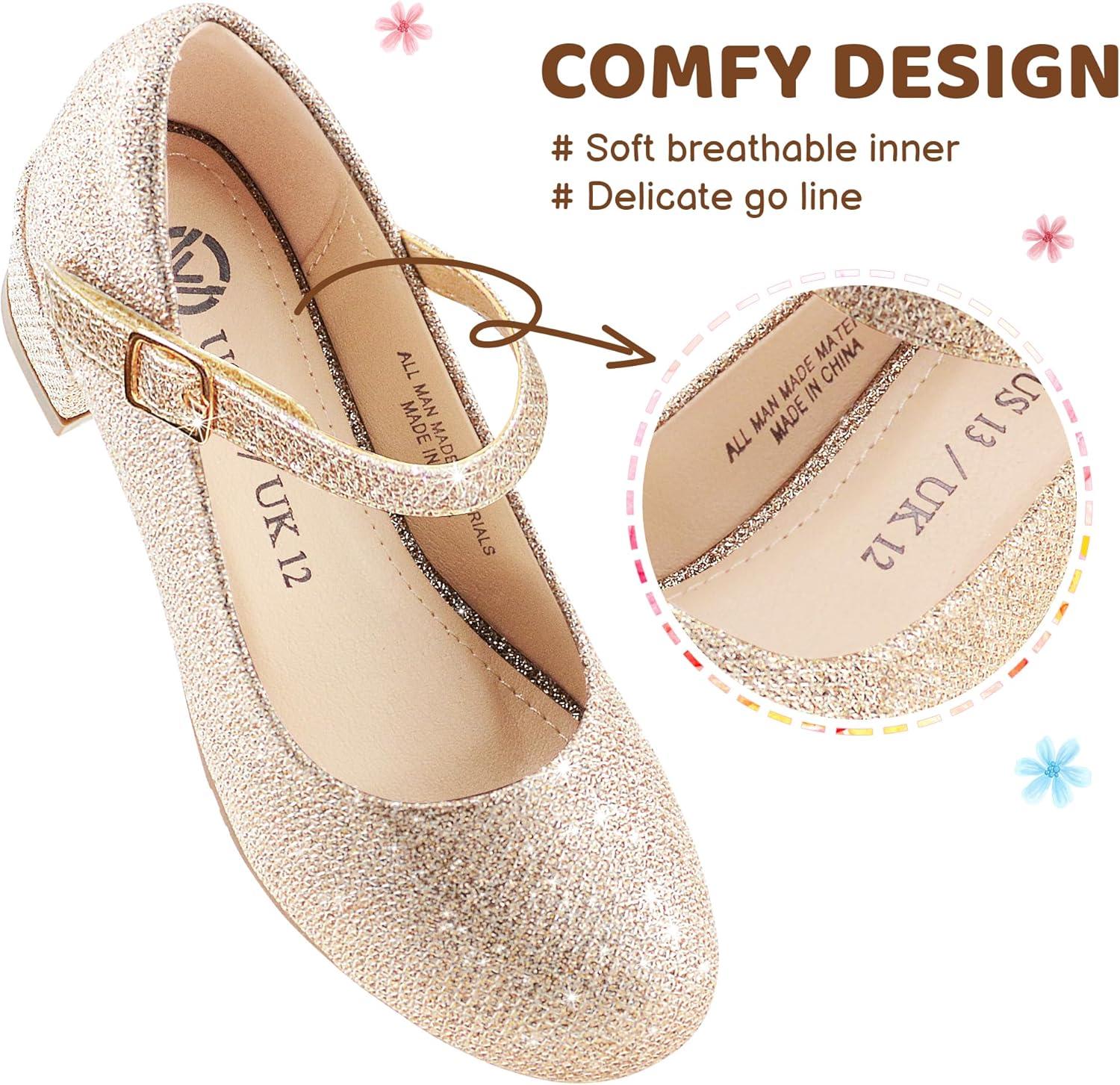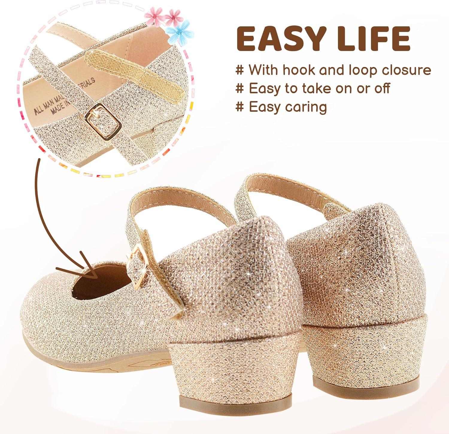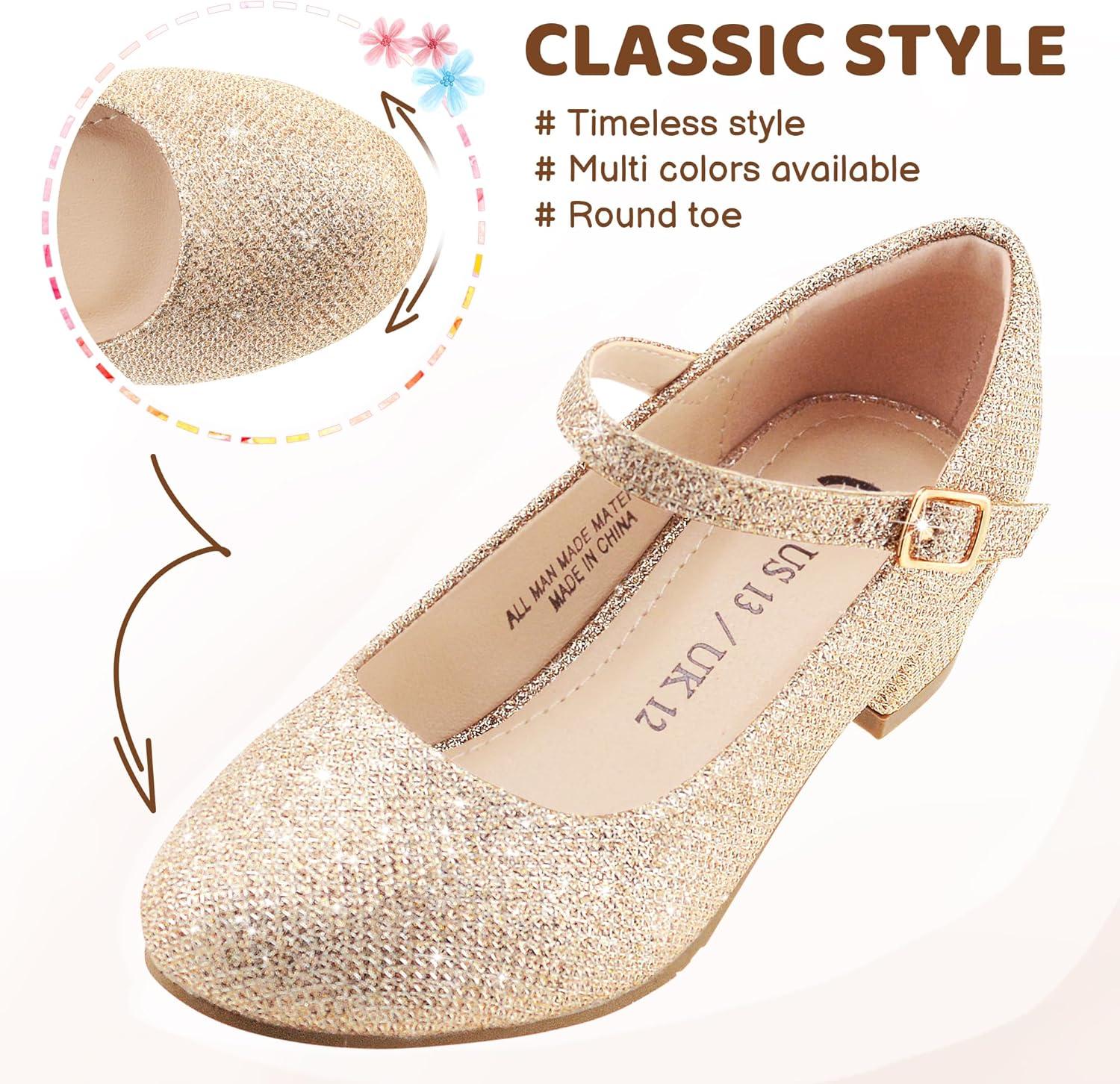 LseLom Girls Dress Shoes-Mary Jane Shoes for Girls Low Heel Princess Hook and Loop Dress Shoes Party Wedding Flats for Little/Big Kids(Gold)
