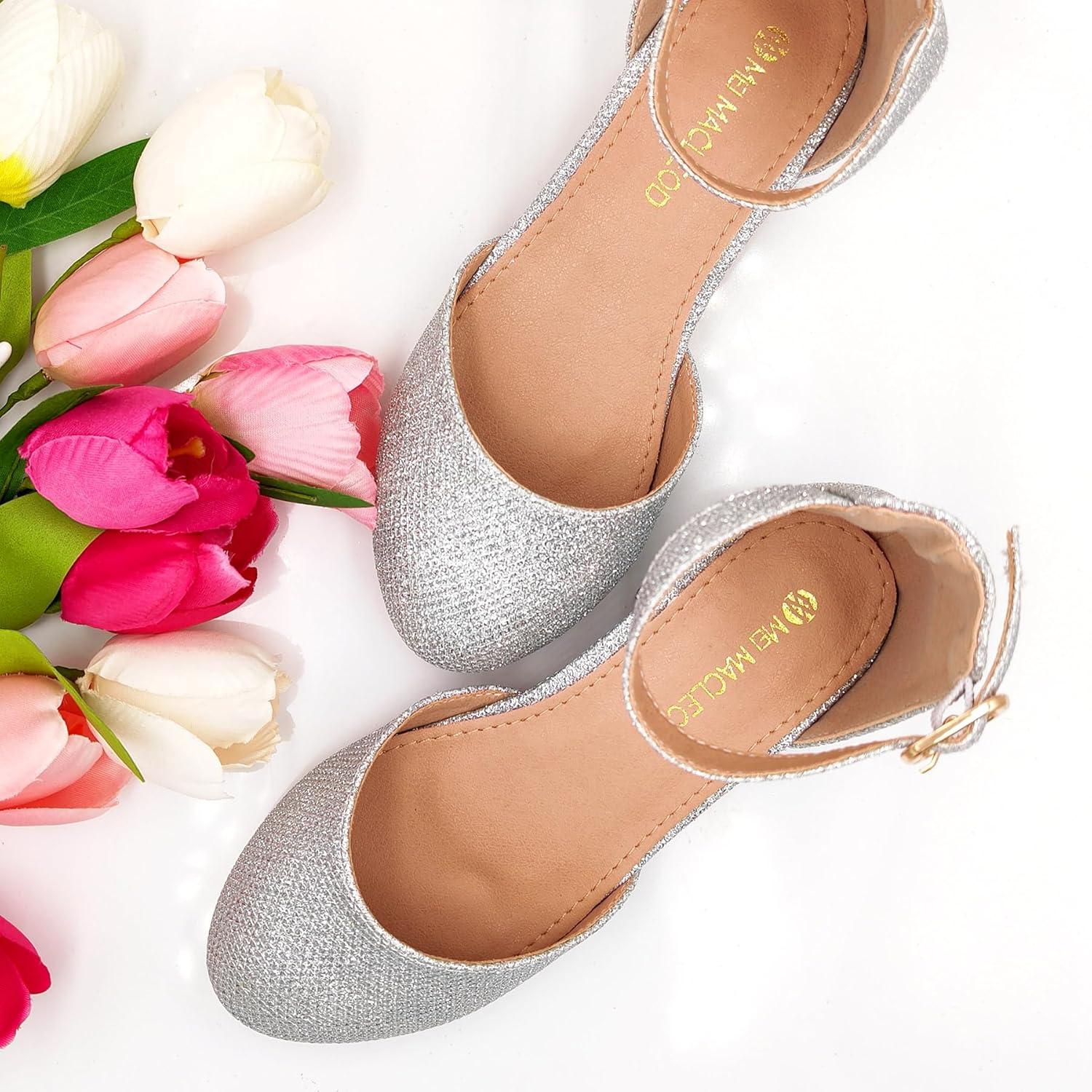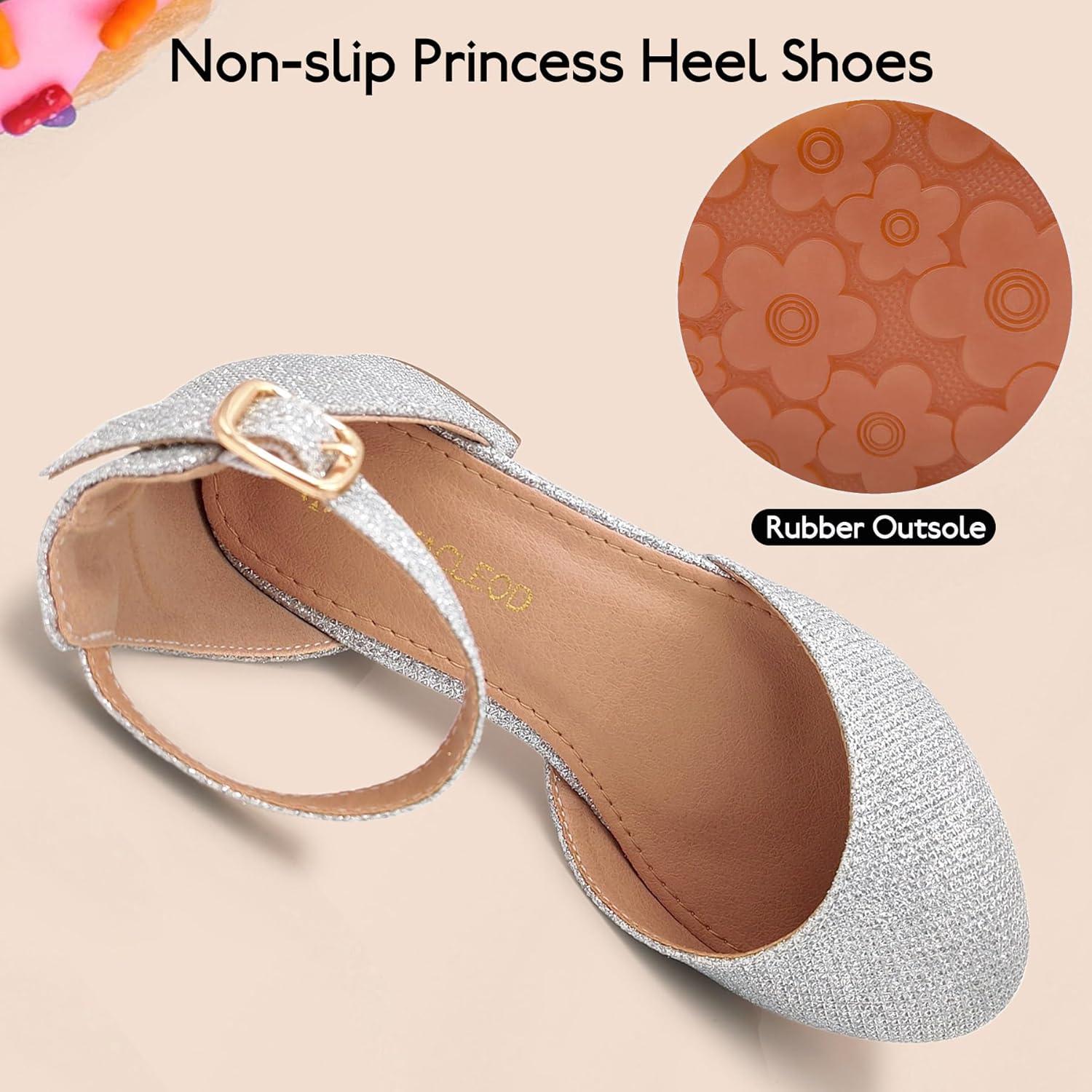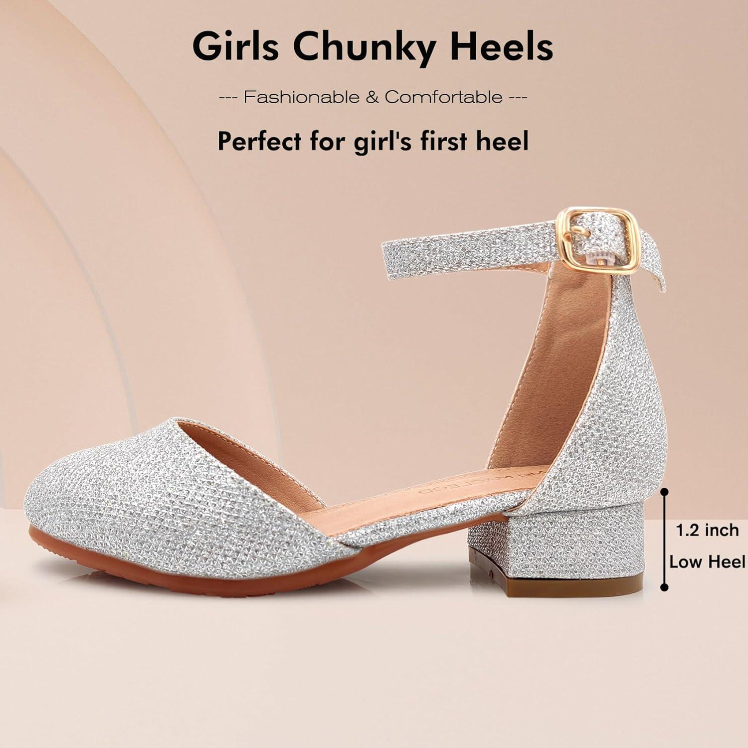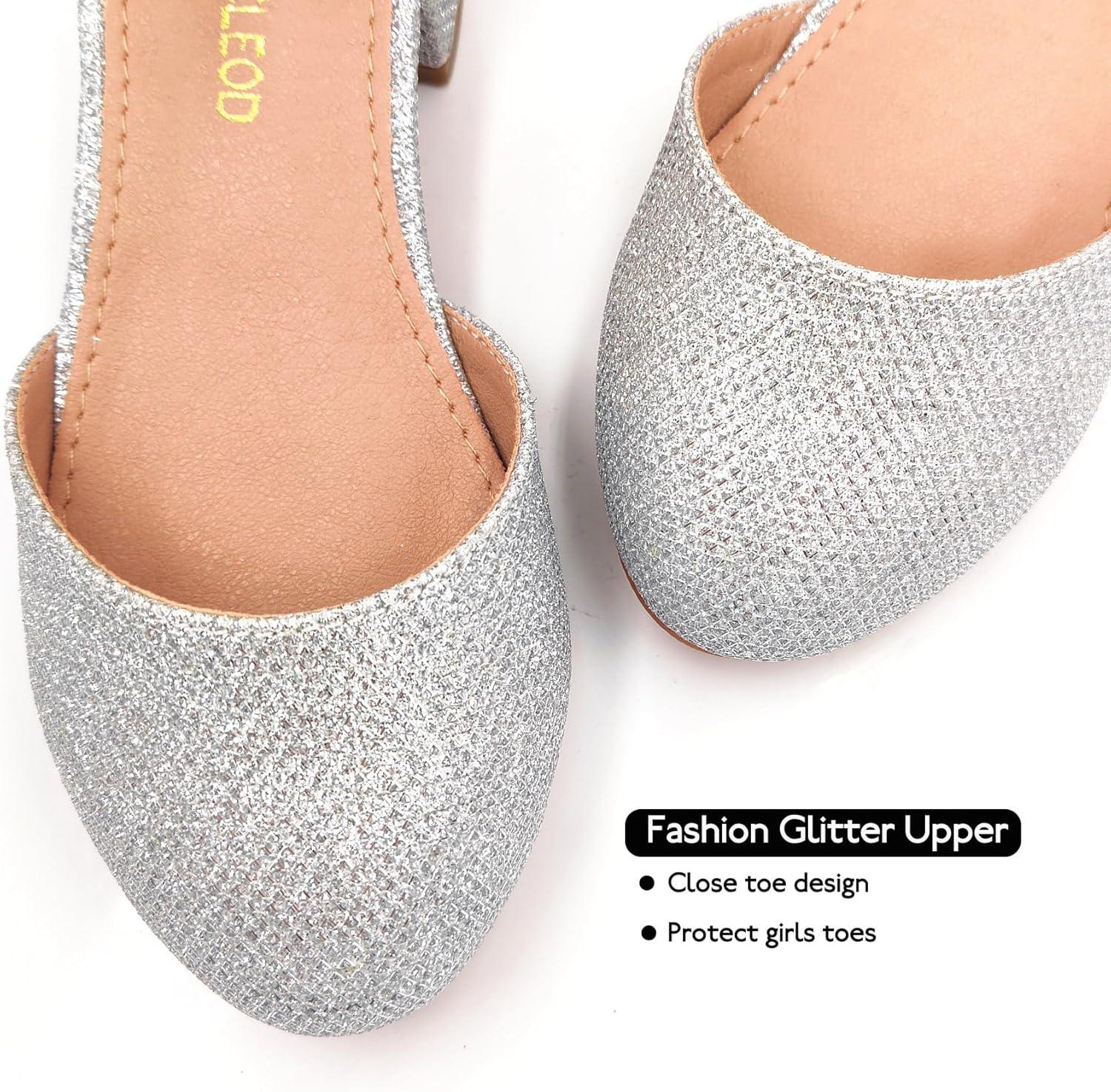 Mei MACLEOD Girls Dress Shoes Sparkly Princess Low Heel Shoes Chunky Heels with Ankle Strap for Wedding Holiday Party(Glitter Silver)