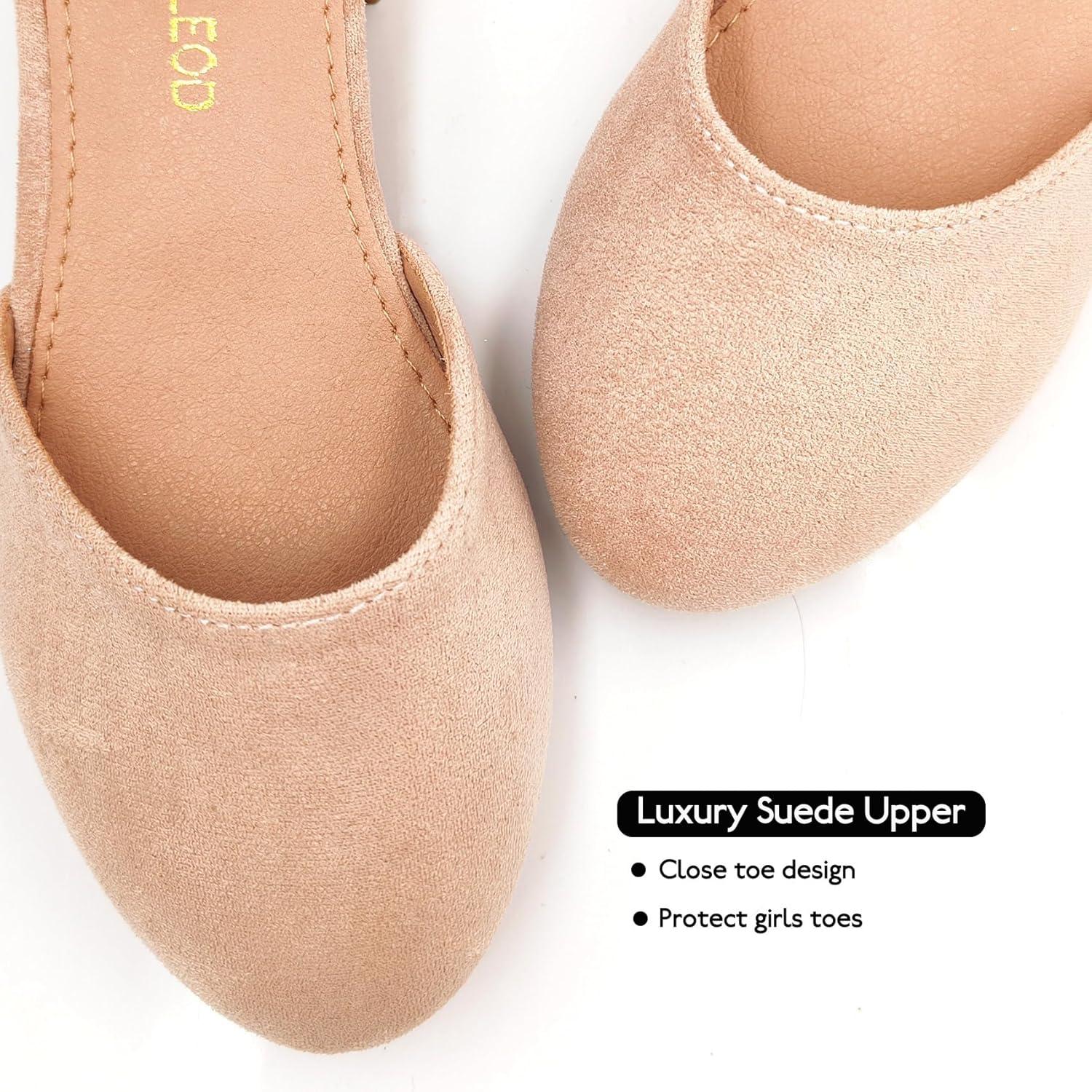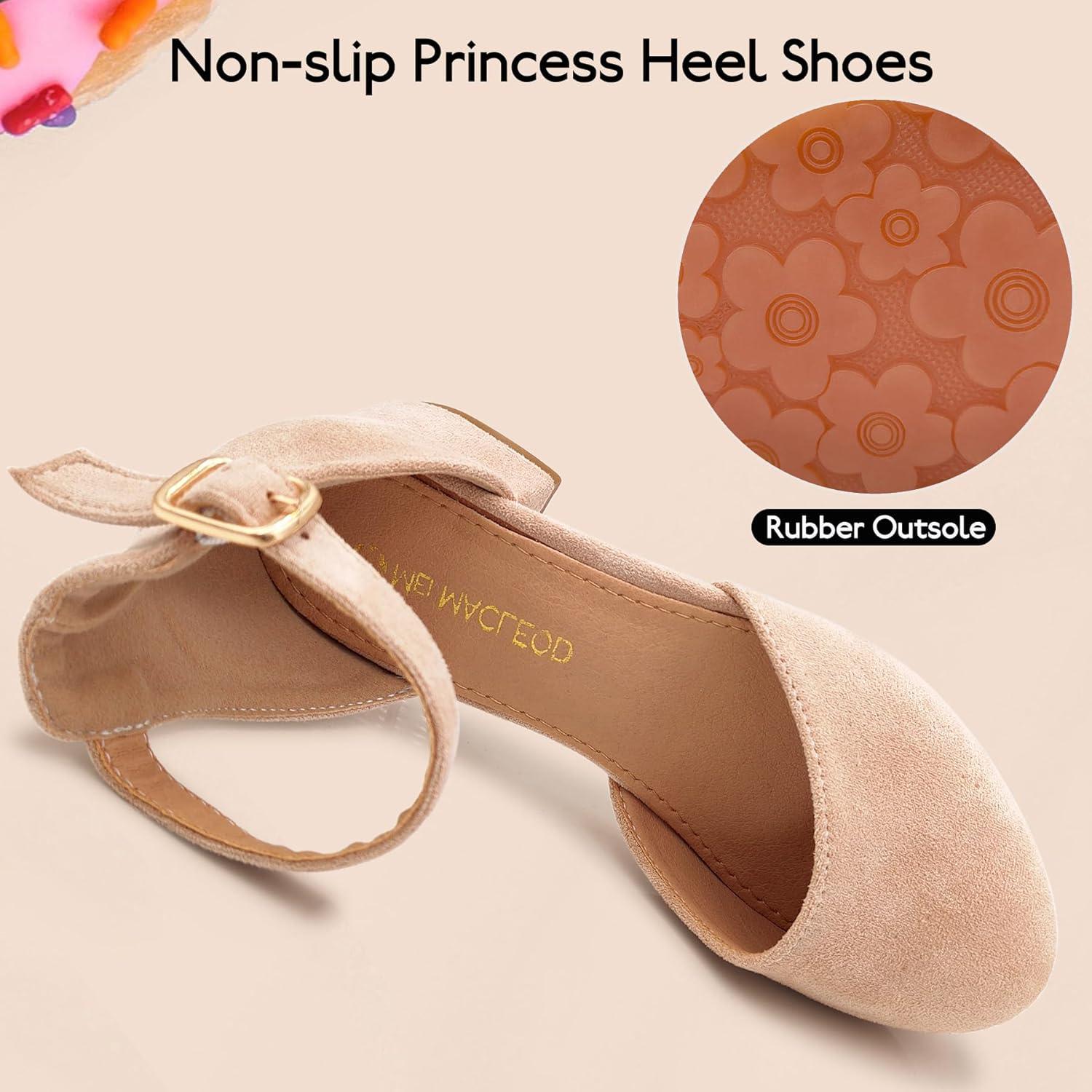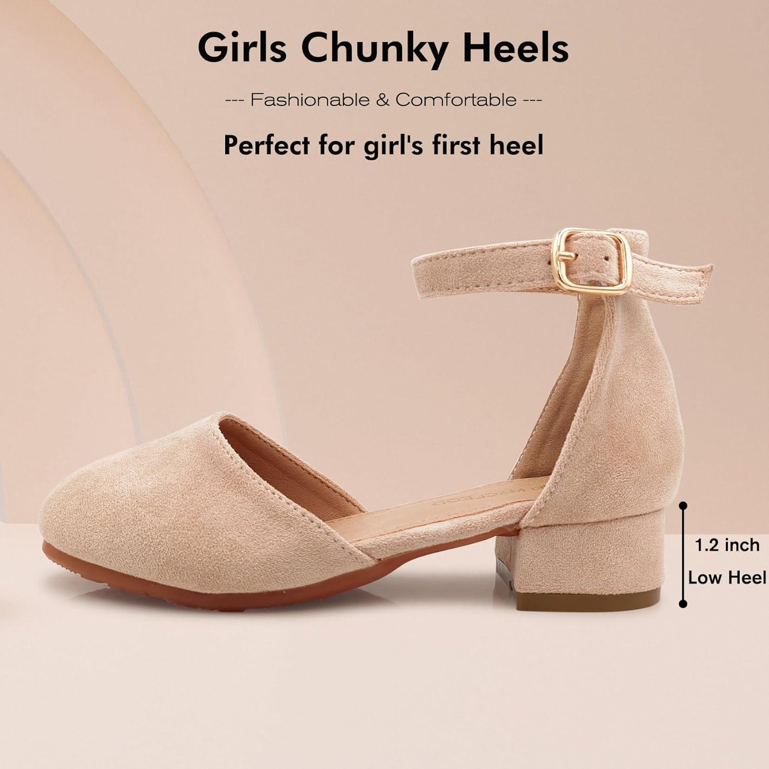Mei MACLEOD Girls Dress Shoes Sparkly Princess Low Heel Shoes Chunky Heels with Ankle Strap for Wedding Holiday Party(Suede Nude)