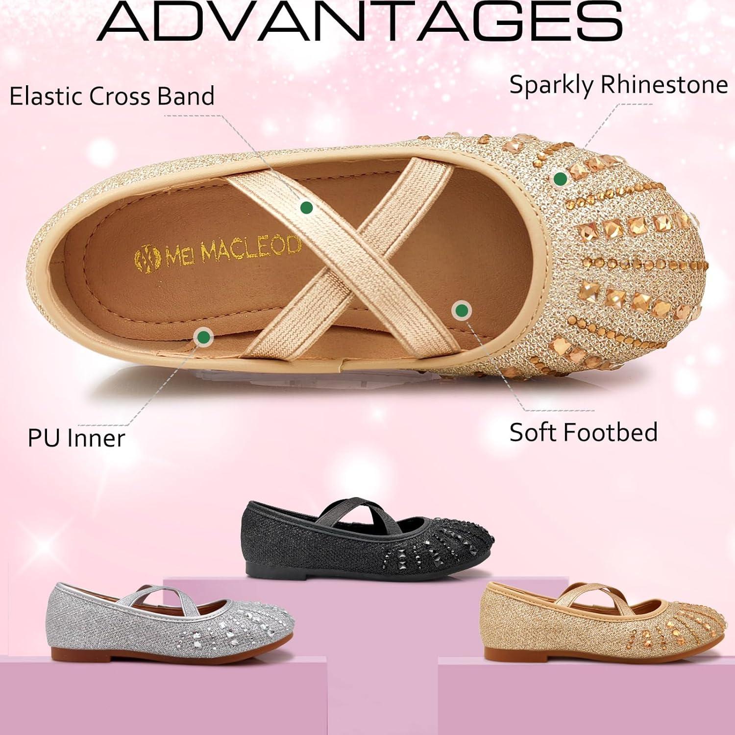 Mei MACLEOD Girl’s Mary Jane Shoes Ballerina Shoes, Princess Dress Shoes for Party Wedding(Rhinestone-gold)