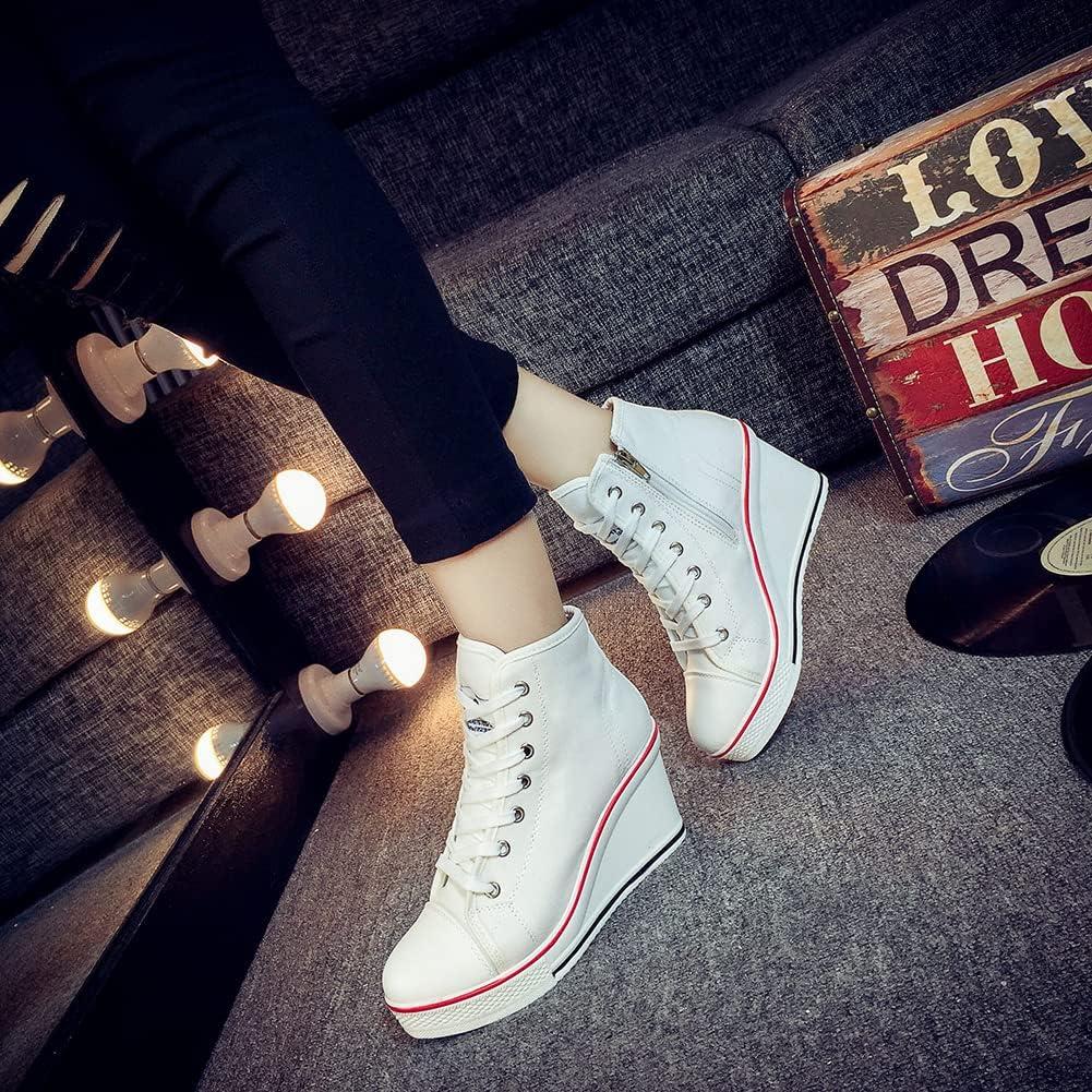 Womens Lace Up Heel Sneakers, Platform Wedge Sneakers Ankle Booties with Zipper Casual Canvas Fashion Sneaker for Girls(White)